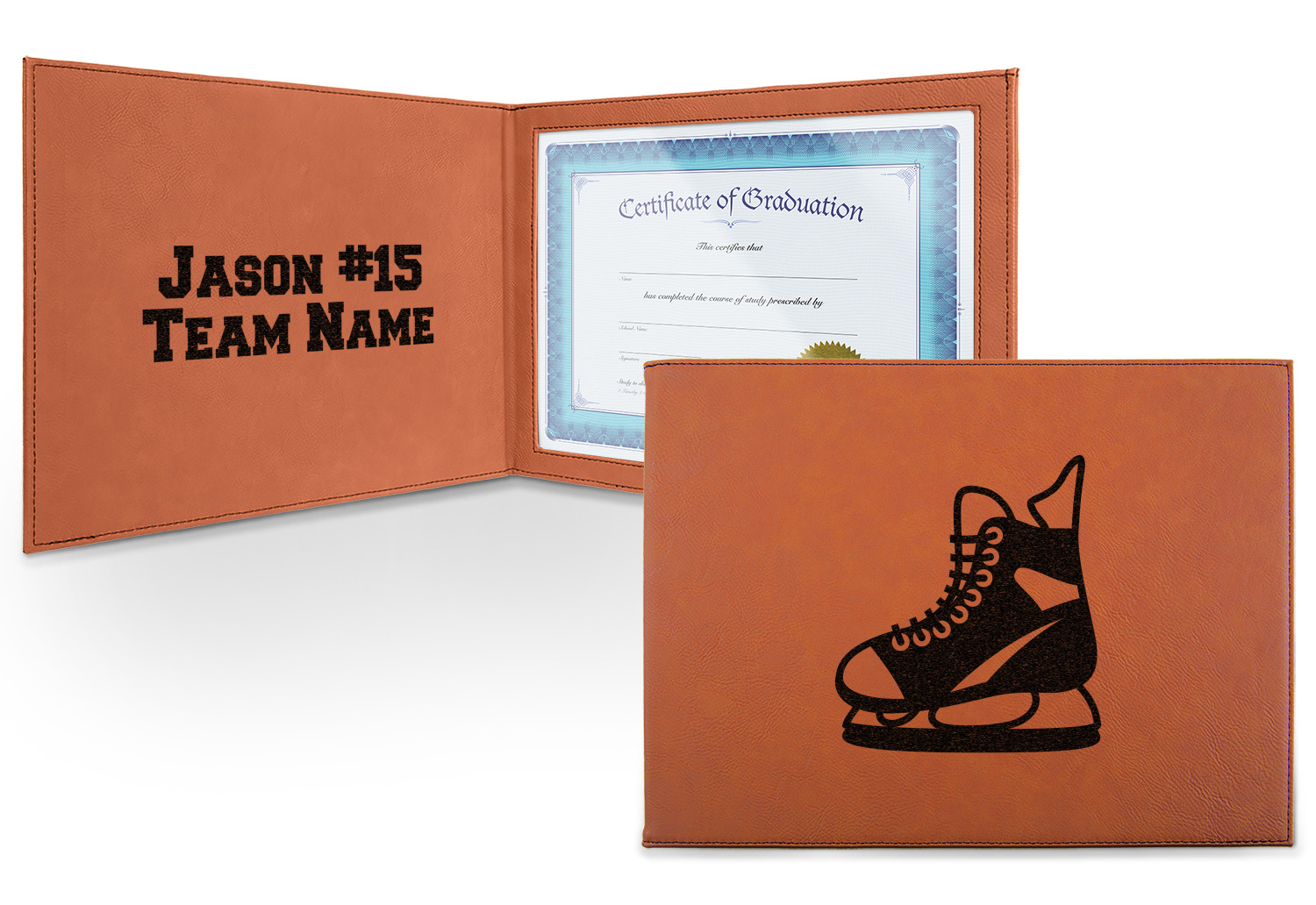 This cognac-colored, leatherette certificate jacket is the ideal way to display or store your hard-earned certificate. When closed, the custom certificate holder measures at 12 by 9 inches. The interior of the certificate cover includes a clear, vinyl window to encase your diploma. The window measures at around 10.5 by 7.5 inches and can accommodate a diploma that measures at up to 8.5 by 11 inches. You can either choose to have your customization laser engraved on the front and interior, or solely the front.