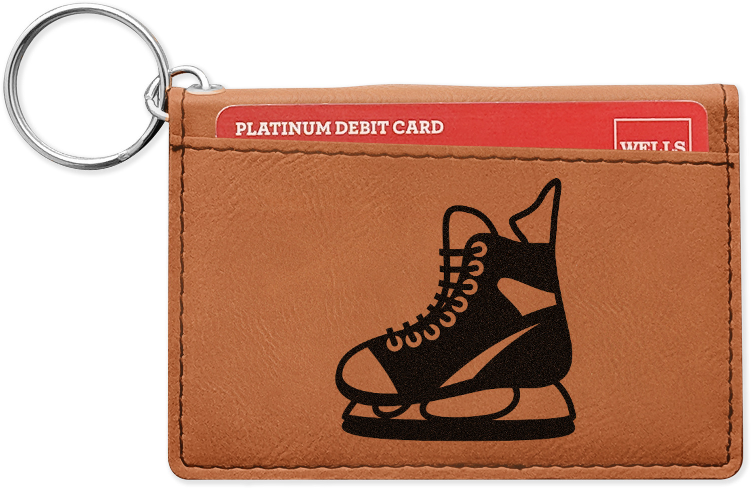 These ID wallet keychains features three pockets on the inside to accommodate your ID and your most frequently used cards. Another pocket occupies the front of the wallet's exterior, and can hold some cash or another card. The wallet is accompanied by a thick metal ring for easy attachment to a belt clip or purse. Each card holder keychain measures at 4.25 by 3 inches and is a beautiful, cognac, medium-brown shade. The personalized monogram, font, or graphic of your choosing is laser engraved into the surface of the wallet, creating a black imprint. We sell these ID wallets in two models: single sided and double sided engraving.