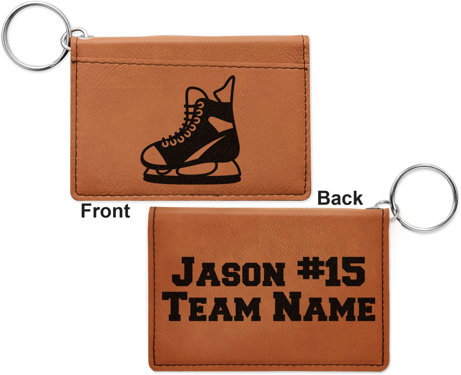 These ID wallet keychains features three pockets on the inside to accommodate your ID and your most frequently used cards. Another pocket occupies the front of the wallet's exterior, and can hold some cash or another card. The wallet is accompanied by a thick metal ring for easy attachment to a belt clip or purse. Each card holder keychain measures at 4.25 by 3 inches and is a beautiful, cognac, medium-brown shade. The personalized monogram, font, or graphic of your choosing is laser engraved into the surface of the wallet, creating a black imprint. We sell these ID wallets in two models: single sided and double sided engraving.