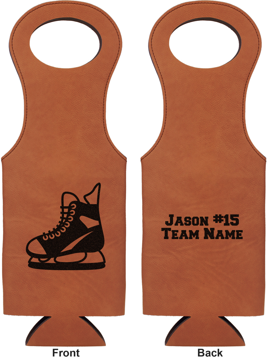 This wine carrier is made from a stunning leatherette, in a cognac-brown color. Strong, black stitching lines the sides of your wine bottle bag and provides extra durability. The interior is lined with a padded, black material to allow for a snug fit once your bottle is placed inside. At the top of this wine gift bag, you'll find two oval shaped handles that elegantly complements the rest of the bag's style. We provide you with the option of laser-engraving the front, or the front and back of your new personalized wine bag!