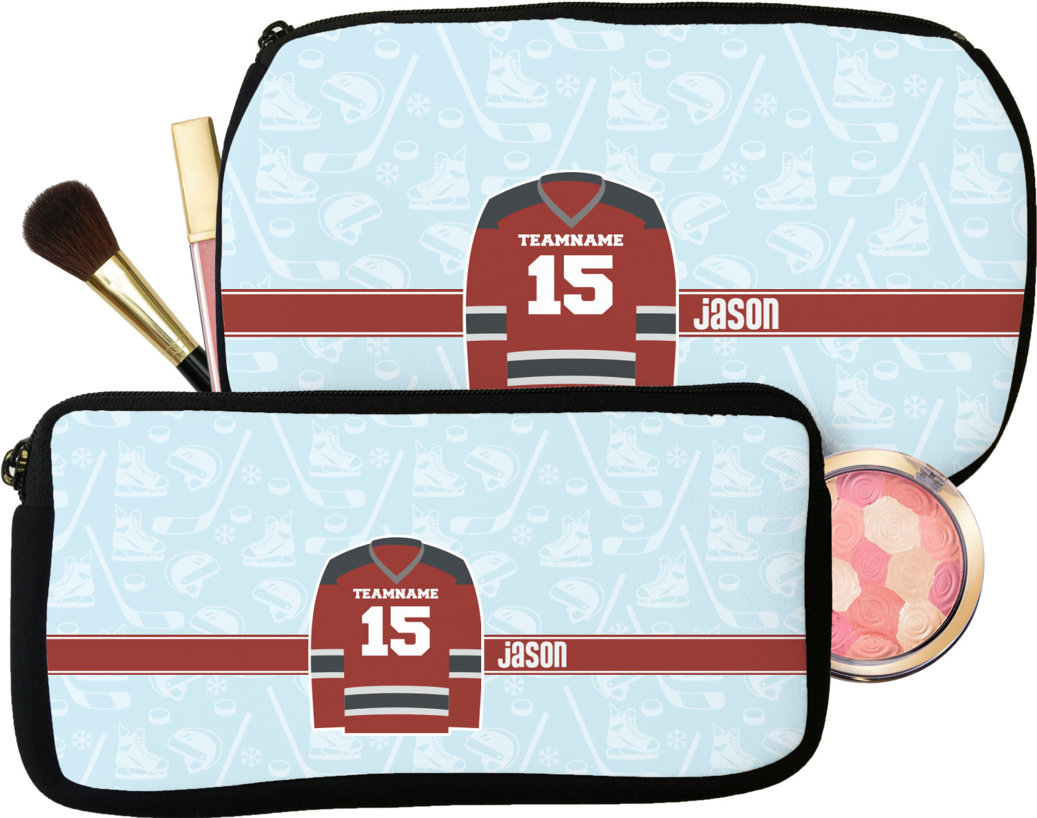 Our personalized makeup bags are available in many different designs, patterns and colors - so you are sure to find one that will love. They are made of neoprene (same material as wet-suits) and thus are water resistant, so spillages in your makeup bag will not end up all over you purse. They are customized on one side and are black on the other side and the zipper is black as well.