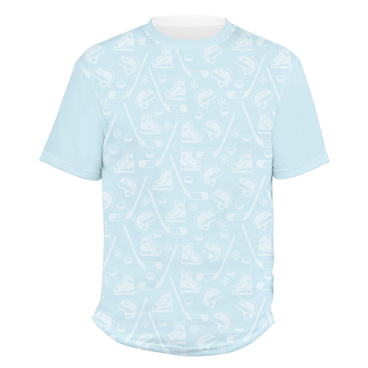 This design features a white background, reminiscent of ice, with hockey pucks repeating on it. The main design has a red hockey jersey in the foreground that can be customized with your favorite team's colors. This design perfect for any die-hard hockey fans!