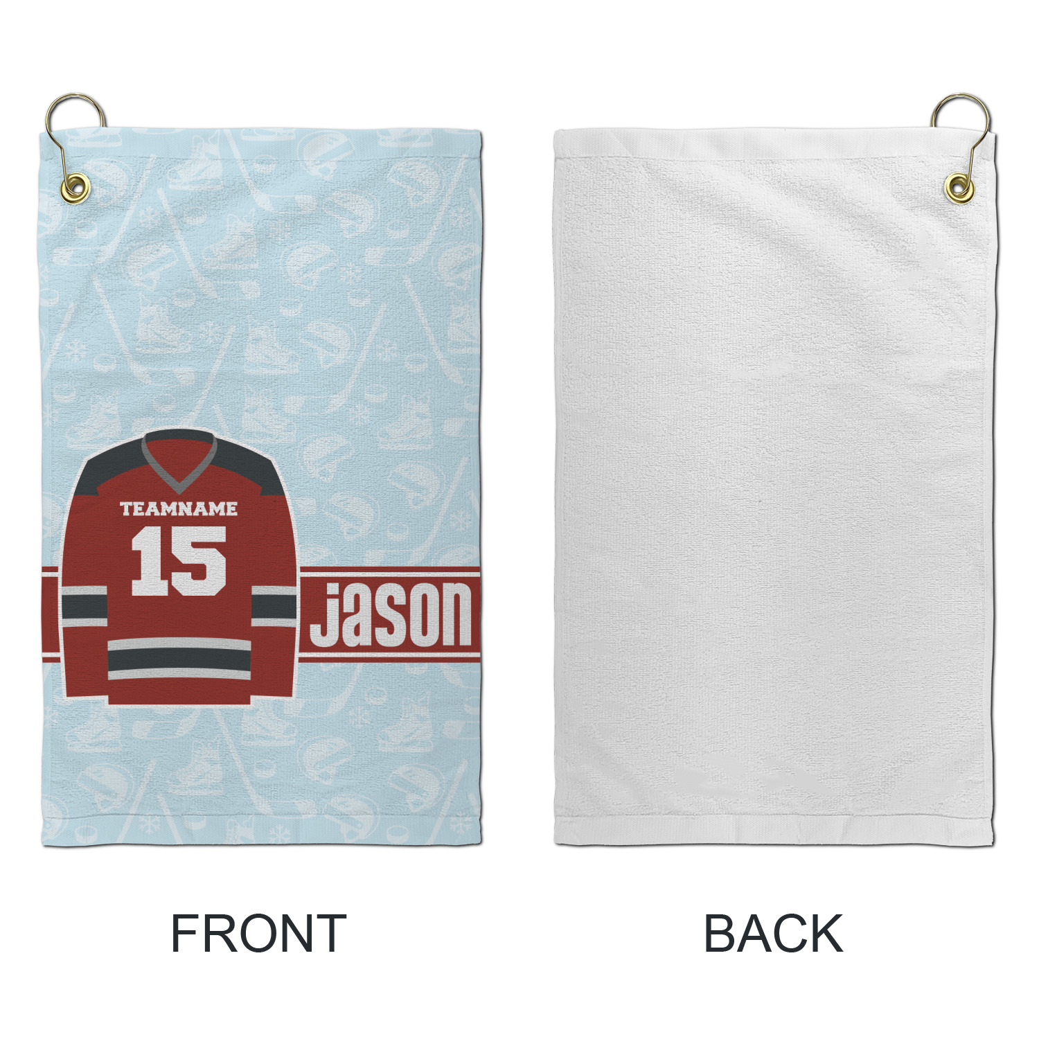 This design features a white background, reminiscent of ice, with hockey pucks repeating on it. The main design has a red hockey jersey in the foreground that can be customized with your favorite team's colors. This design perfect for any die-hard hockey fans!