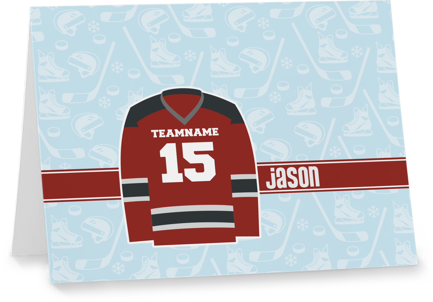 This design features a white background, reminiscent of ice, with hockey pucks repeating on it. The main design has a red hockey jersey in the foreground that can be customized with your favorite team's colors. This design perfect for any die-hard hockey fans!