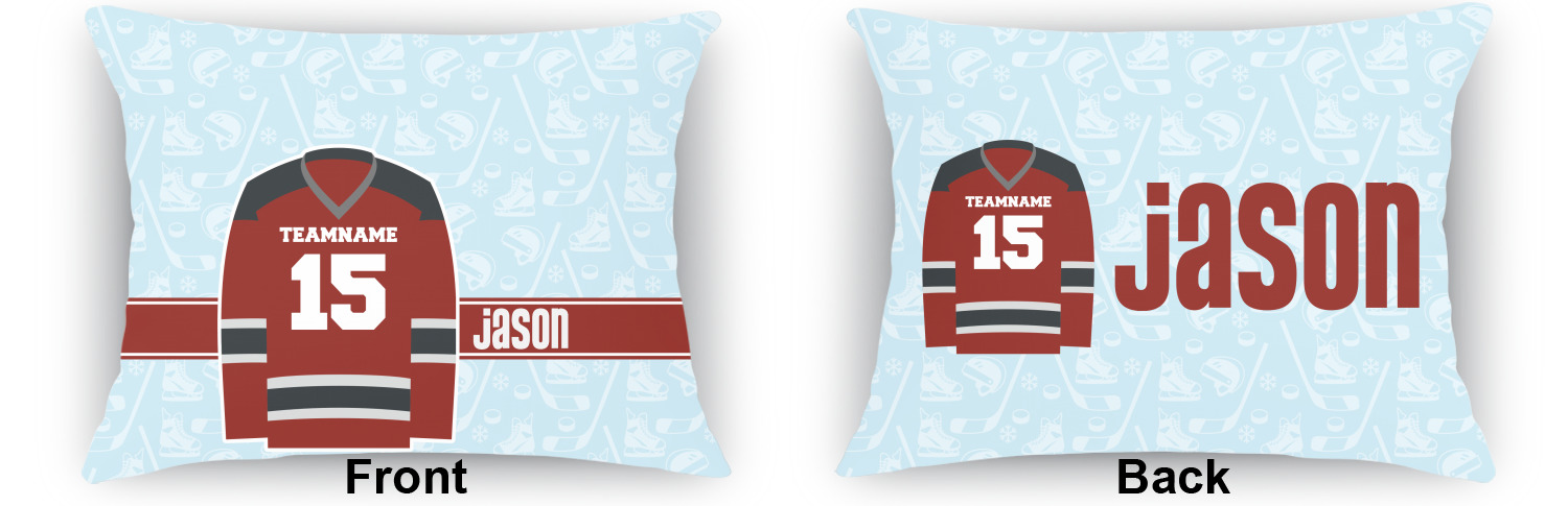 This design features a white background, reminiscent of ice, with hockey pucks repeating on it. The main design has a red hockey jersey in the foreground that can be customized with your favorite team's colors. This design perfect for any die-hard hockey fans!