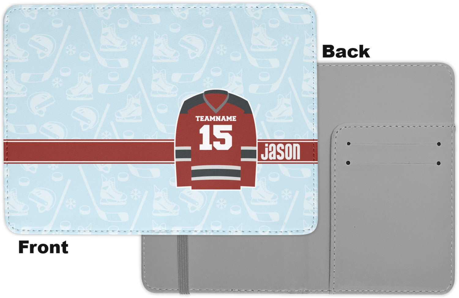 This design features a white background, reminiscent of ice, with hockey pucks repeating on it. The main design has a red hockey jersey in the foreground that can be customized with your favorite team's colors. This design perfect for any die-hard hockey fans!