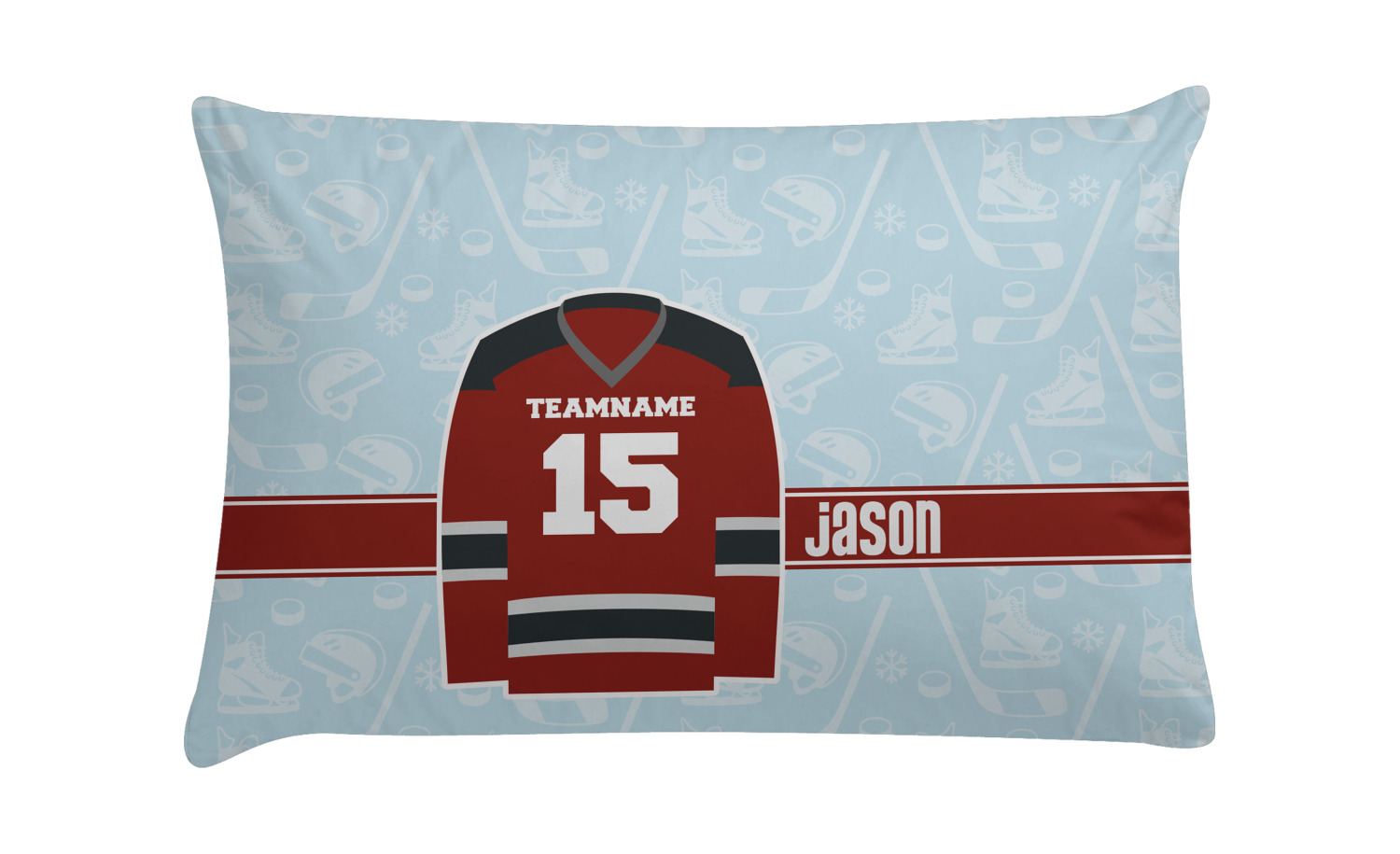 This design features a white background, reminiscent of ice, with hockey pucks repeating on it. The main design has a red hockey jersey in the foreground that can be customized with your favorite team's colors. This design perfect for any die-hard hockey fans!