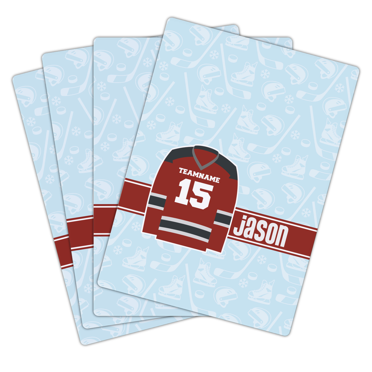 This design features a white background, reminiscent of ice, with hockey pucks repeating on it. The main design has a red hockey jersey in the foreground that can be customized with your favorite team's colors. This design perfect for any die-hard hockey fans!