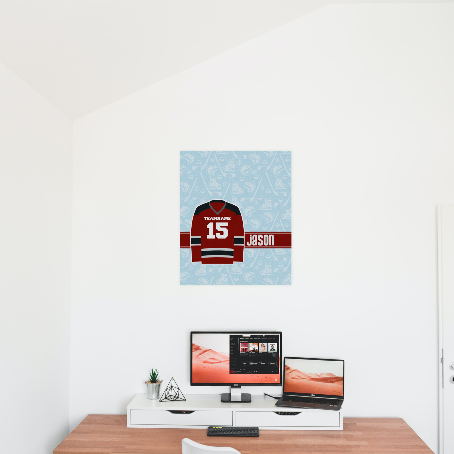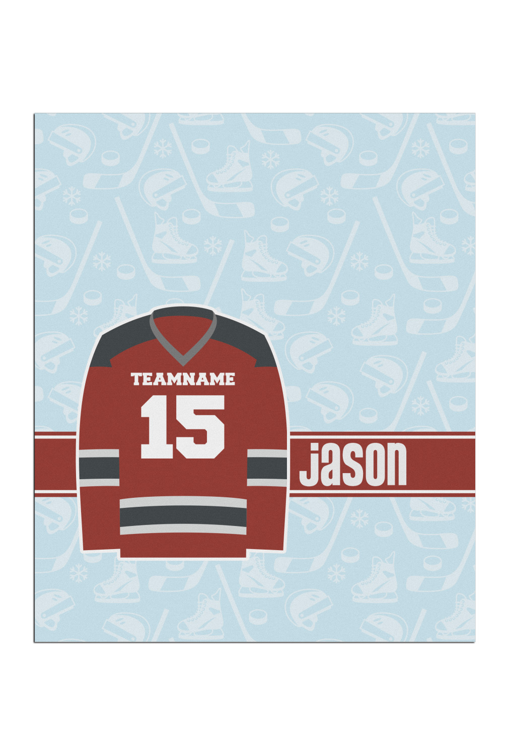 This design features a white background, reminiscent of ice, with hockey pucks repeating on it. The main design has a red hockey jersey in the foreground that can be customized with your favorite team's colors. This design perfect for any die-hard hockey fans!