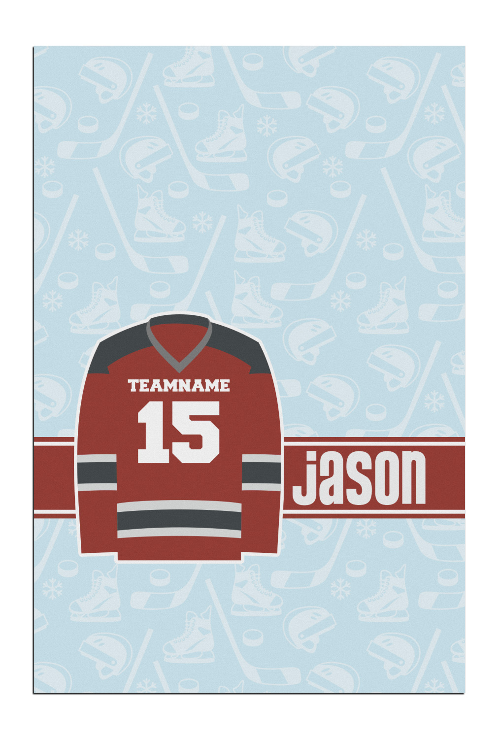 This design features a white background, reminiscent of ice, with hockey pucks repeating on it. The main design has a red hockey jersey in the foreground that can be customized with your favorite team's colors. This design perfect for any die-hard hockey fans!