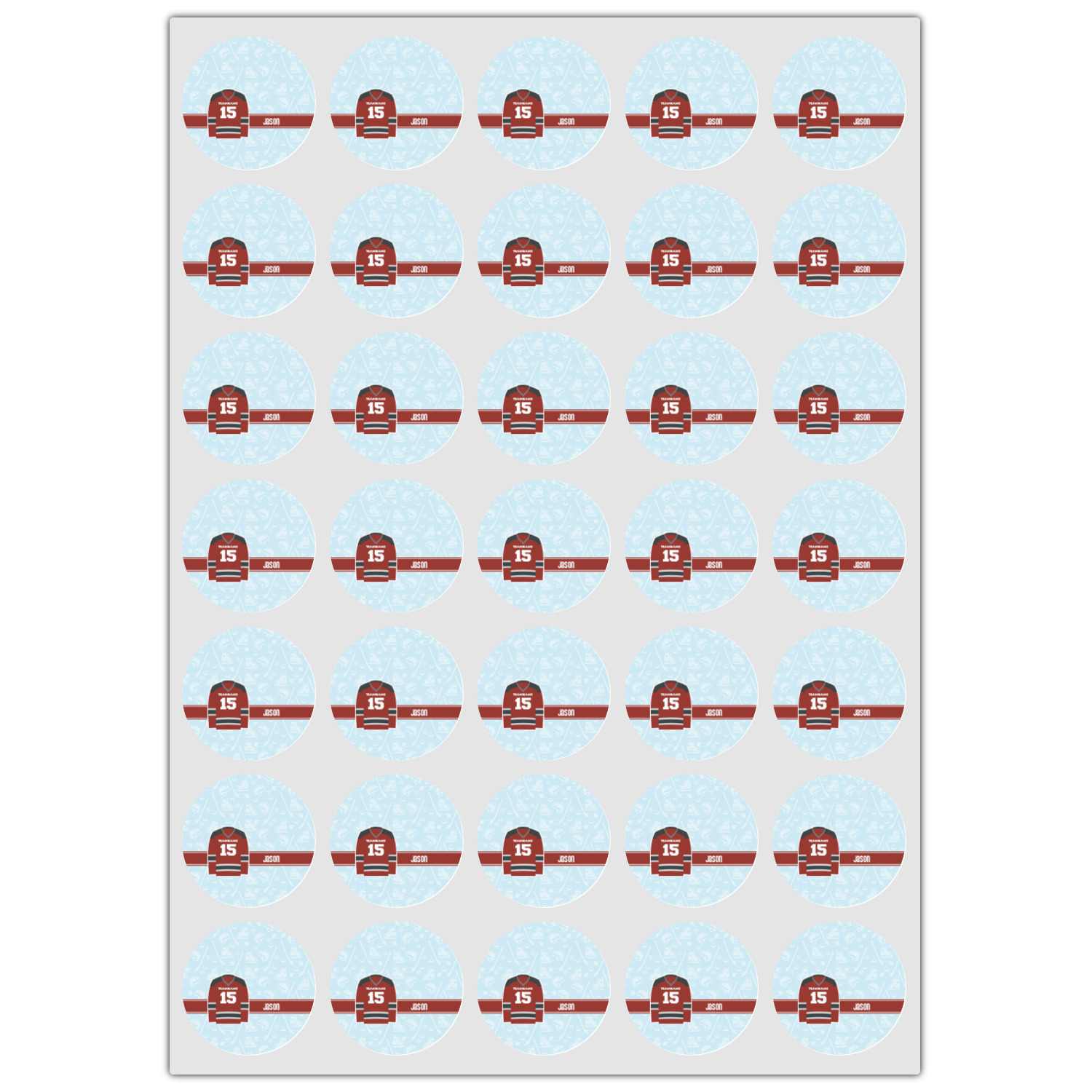 This design features a white background, reminiscent of ice, with hockey pucks repeating on it. The main design has a red hockey jersey in the foreground that can be customized with your favorite team's colors. This design perfect for any die-hard hockey fans!