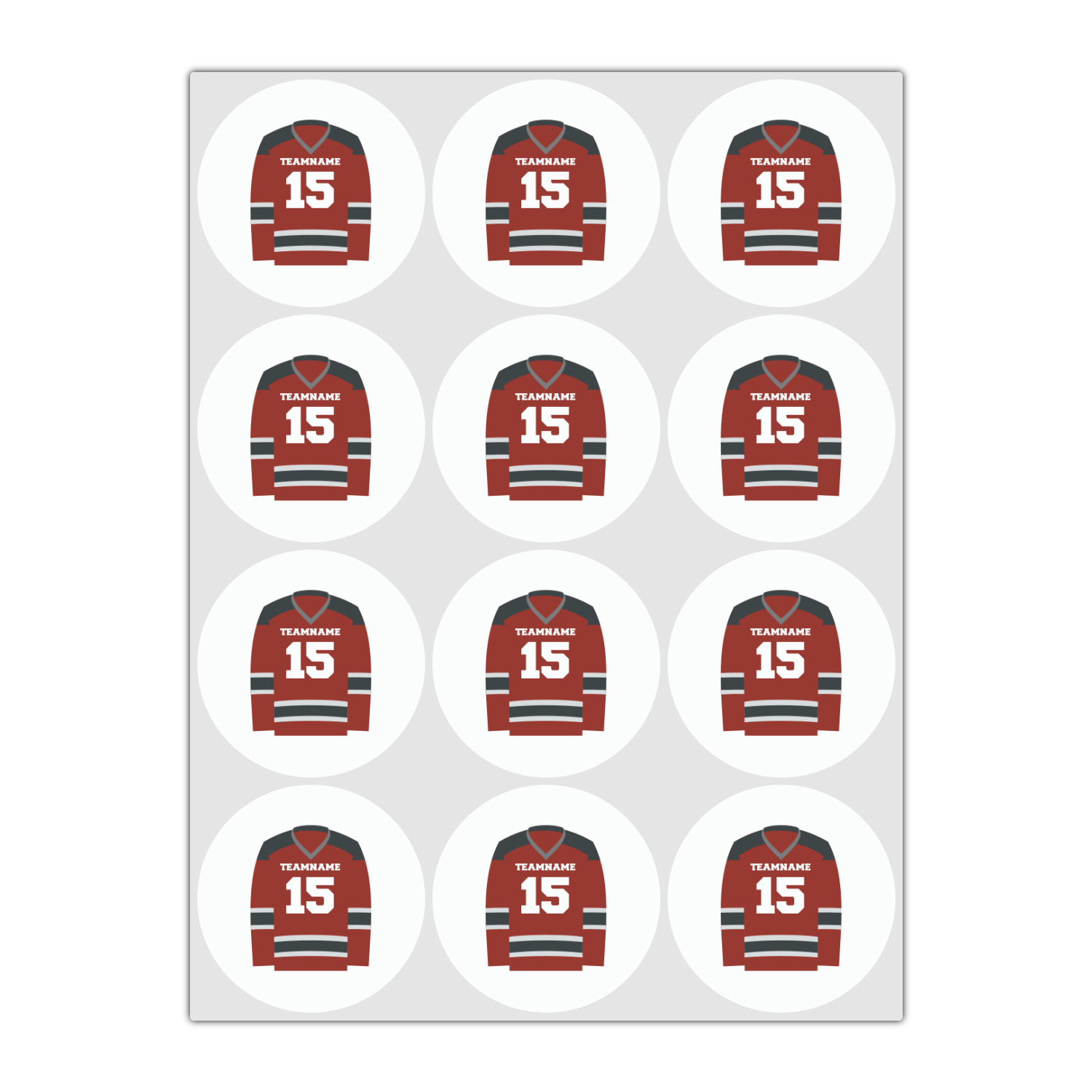 This design features a white background, reminiscent of ice, with hockey pucks repeating on it. The main design has a red hockey jersey in the foreground that can be customized with your favorite team's colors. This design perfect for any die-hard hockey fans!