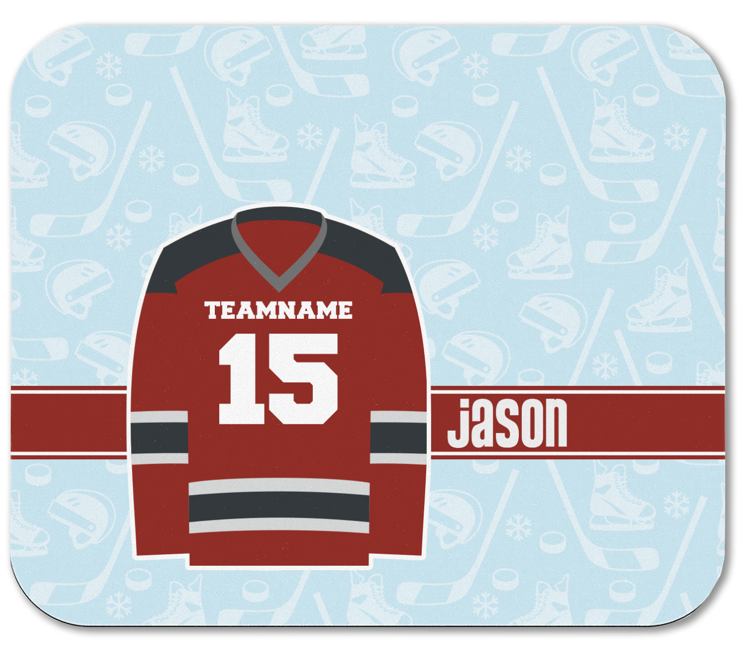 This design features a white background, reminiscent of ice, with hockey pucks repeating on it. The main design has a red hockey jersey in the foreground that can be customized with your favorite team's colors. This design perfect for any die-hard hockey fans!