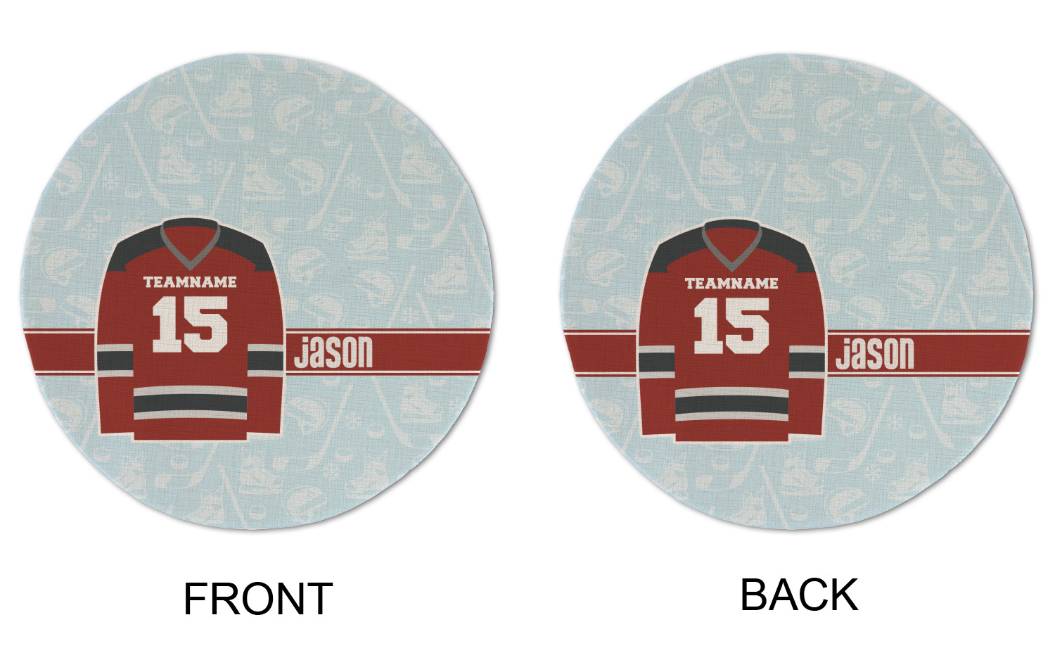This design features a white background, reminiscent of ice, with hockey pucks repeating on it. The main design has a red hockey jersey in the foreground that can be customized with your favorite team's colors. This design perfect for any die-hard hockey fans!