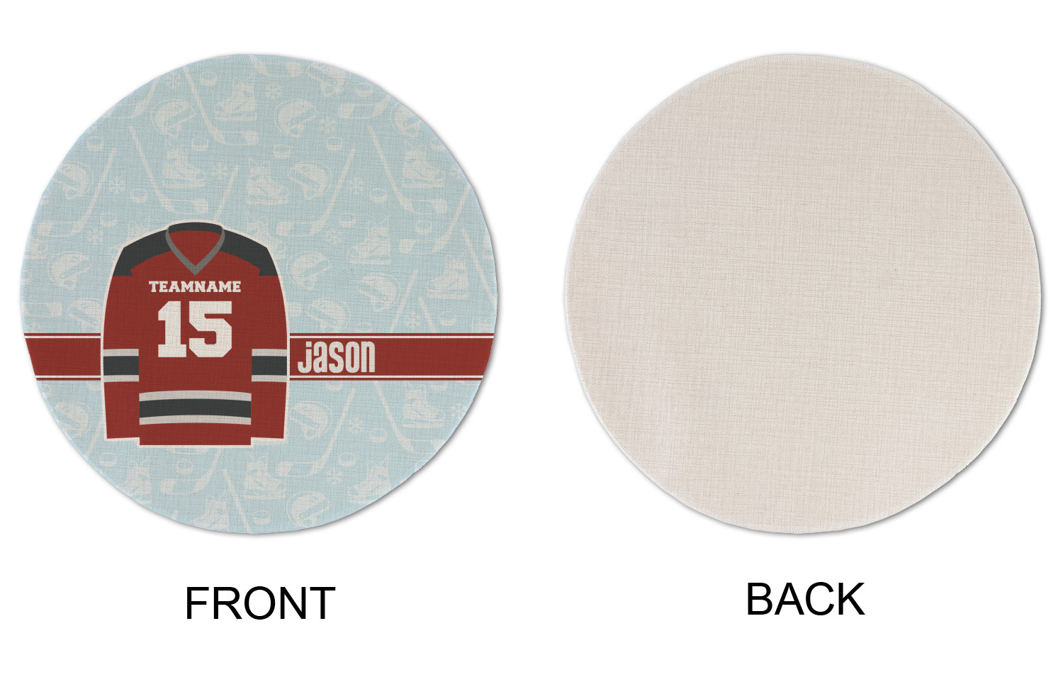 This design features a white background, reminiscent of ice, with hockey pucks repeating on it. The main design has a red hockey jersey in the foreground that can be customized with your favorite team's colors. This design perfect for any die-hard hockey fans!