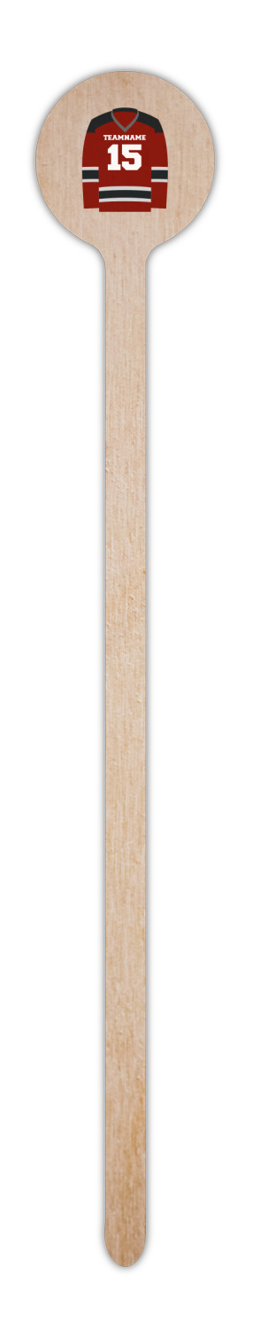 This design features a white background, reminiscent of ice, with hockey pucks repeating on it. The main design has a red hockey jersey in the foreground that can be customized with your favorite team's colors. This design perfect for any die-hard hockey fans!