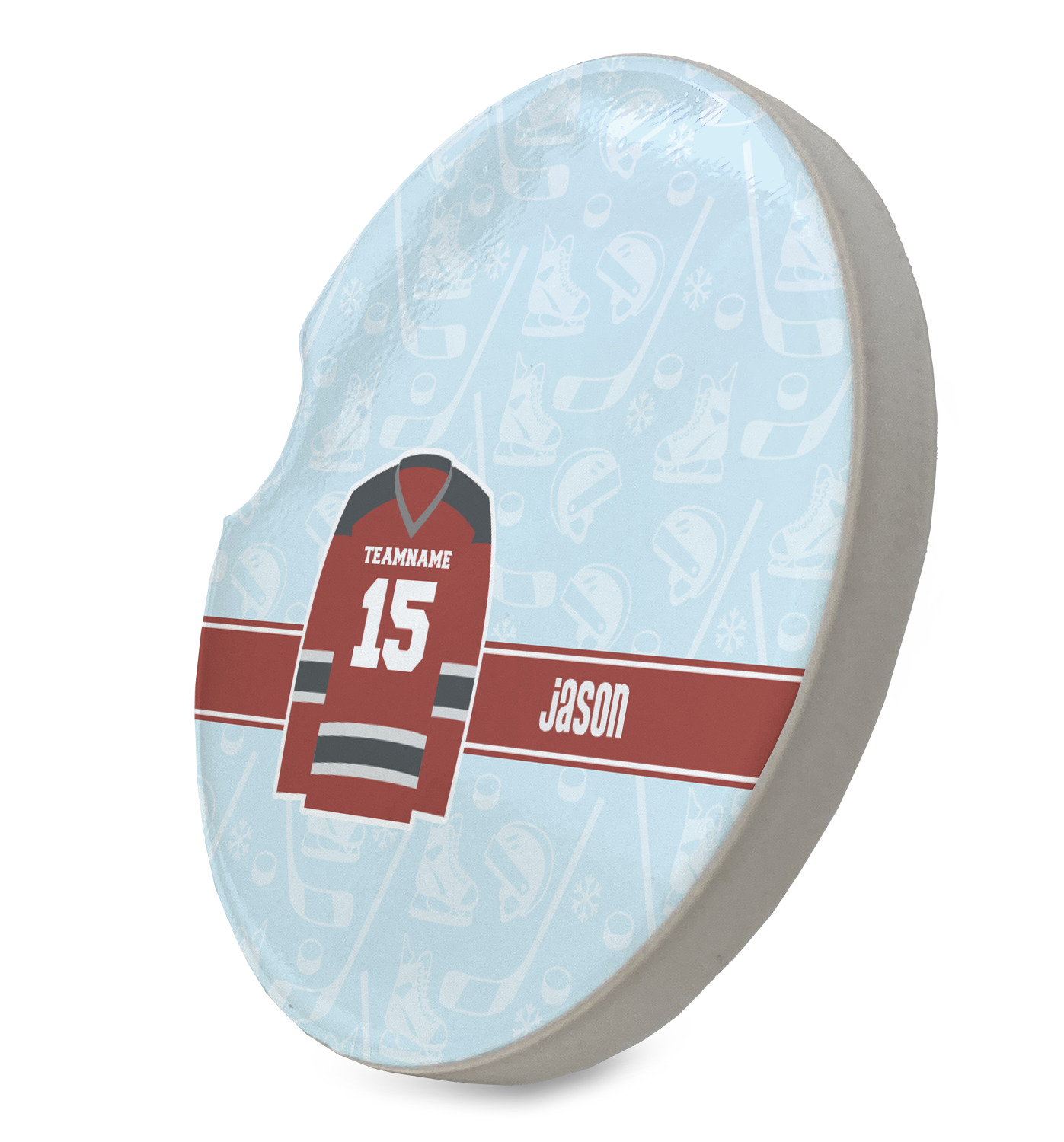 This design features a white background, reminiscent of ice, with hockey pucks repeating on it. The main design has a red hockey jersey in the foreground that can be customized with your favorite team's colors. This design perfect for any die-hard hockey fans!
