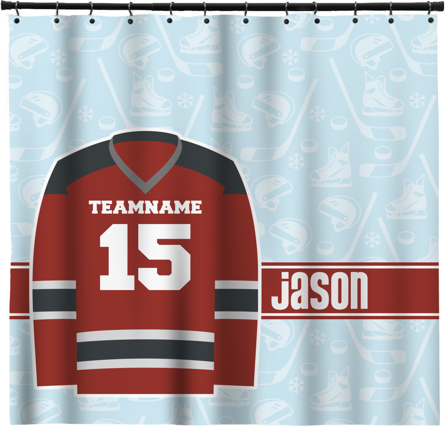 This design features a white background, reminiscent of ice, with hockey pucks repeating on it. The main design has a red hockey jersey in the foreground that can be customized with your favorite team's colors. This design perfect for any die-hard hockey fans!