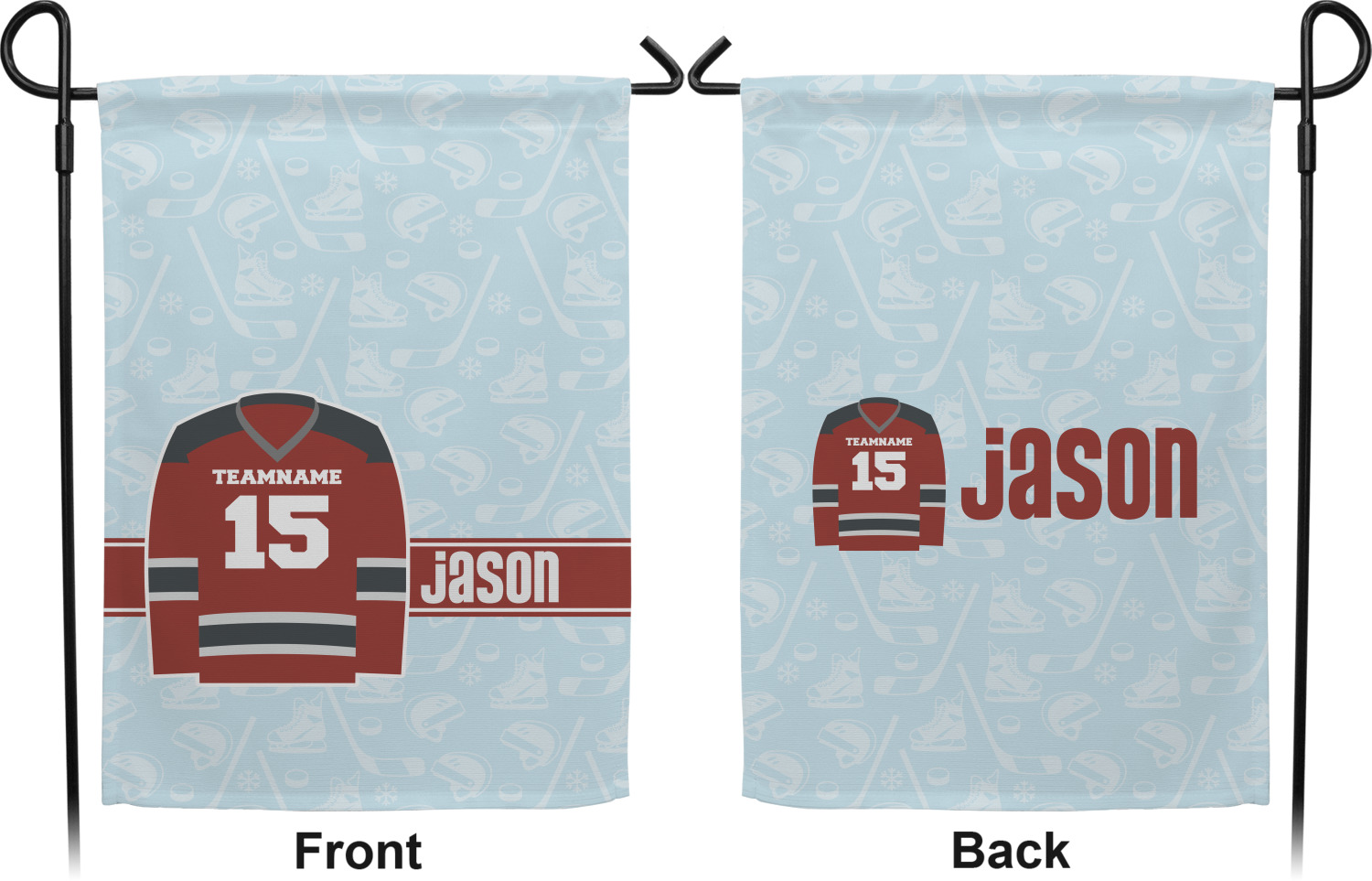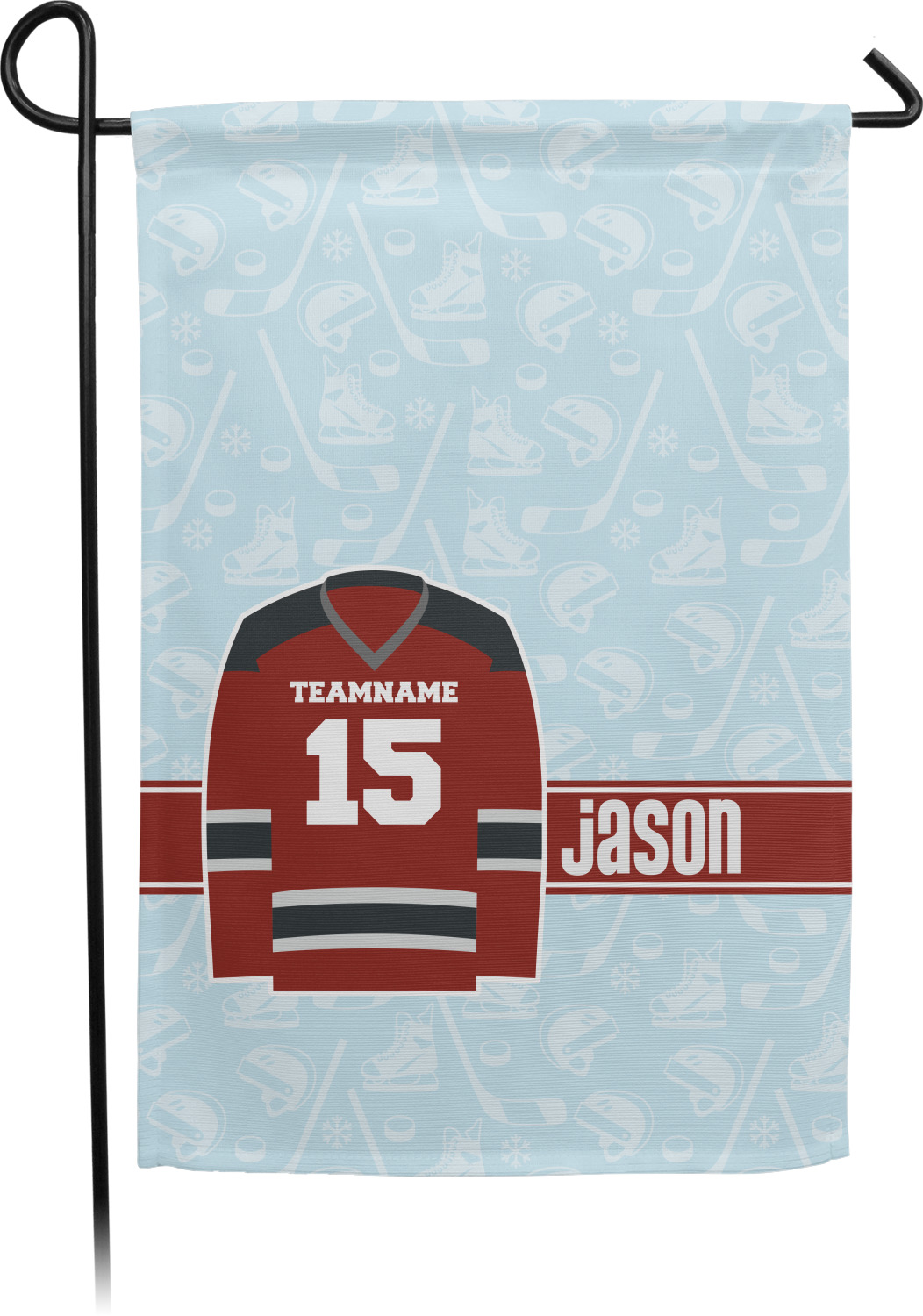 This design features a white background, reminiscent of ice, with hockey pucks repeating on it. The main design has a red hockey jersey in the foreground that can be customized with your favorite team's colors. This design perfect for any die-hard hockey fans!