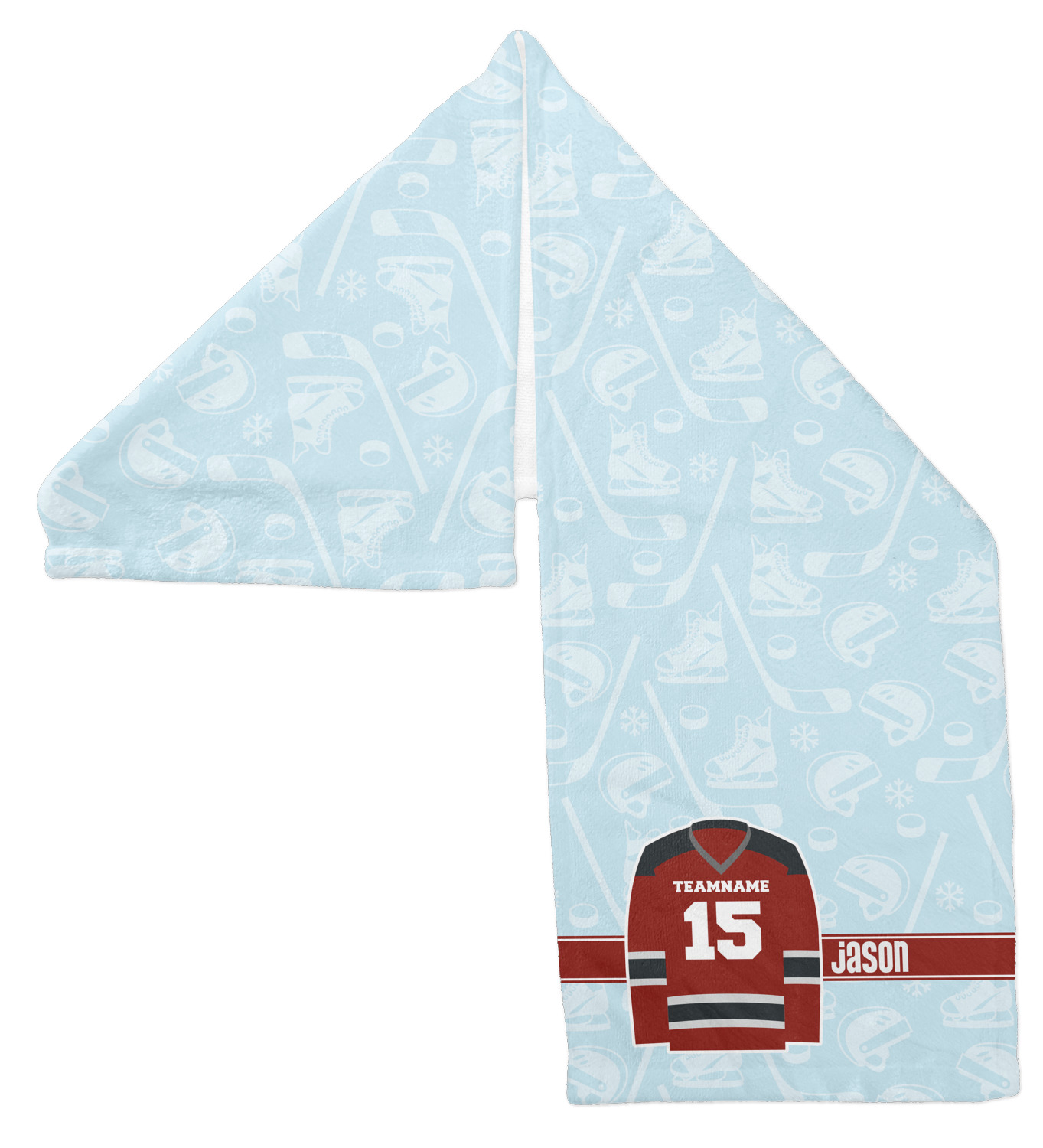 This design features a white background, reminiscent of ice, with hockey pucks repeating on it. The main design has a red hockey jersey in the foreground that can be customized with your favorite team's colors. This design perfect for any die-hard hockey fans!