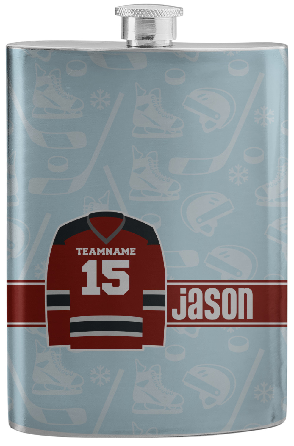 This design features a white background, reminiscent of ice, with hockey pucks repeating on it. The main design has a red hockey jersey in the foreground that can be customized with your favorite team's colors. This design perfect for any die-hard hockey fans!