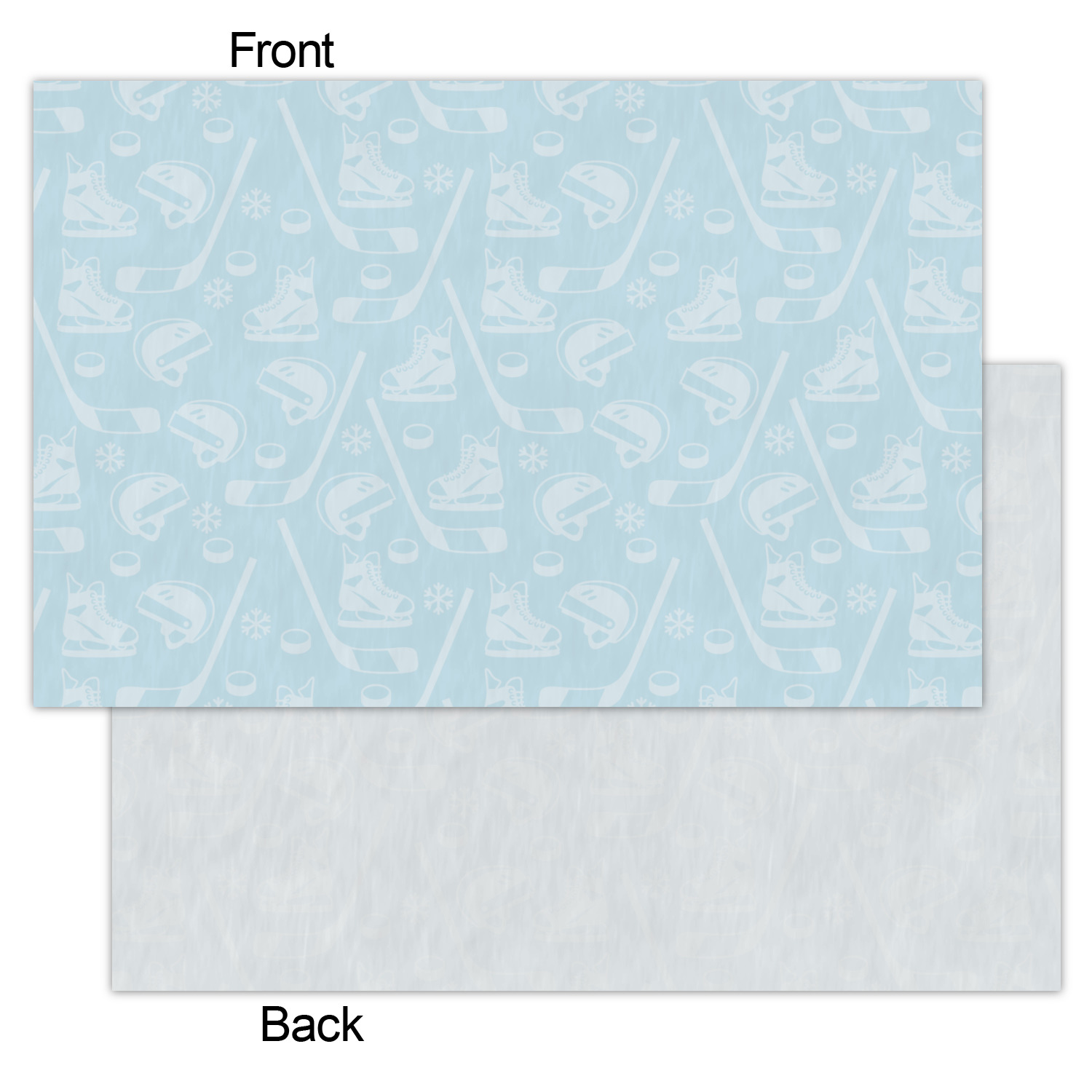 This design features a white background, reminiscent of ice, with hockey pucks repeating on it. The main design has a red hockey jersey in the foreground that can be customized with your favorite team's colors. This design perfect for any die-hard hockey fans!