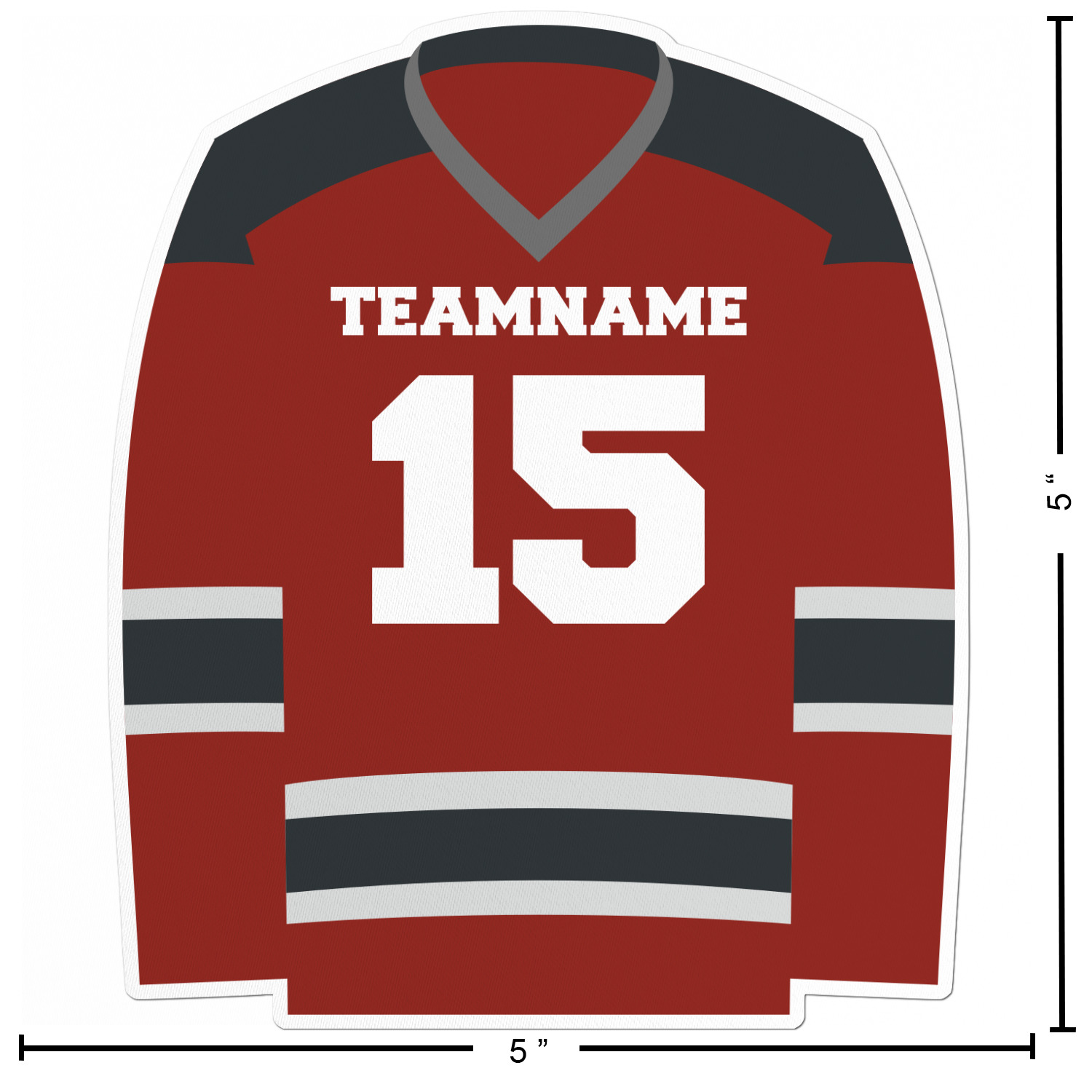 This design features a white background, reminiscent of ice, with hockey pucks repeating on it. The main design has a red hockey jersey in the foreground that can be customized with your favorite team's colors. This design perfect for any die-hard hockey fans!