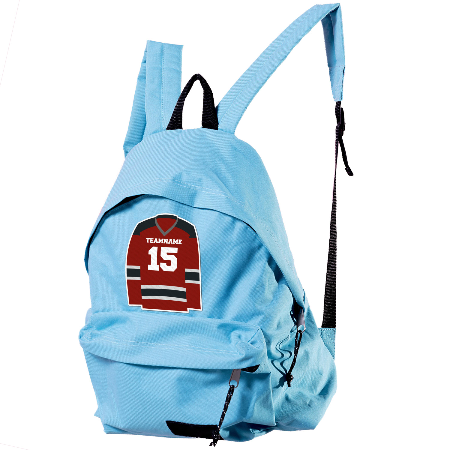 This design features a white background, reminiscent of ice, with hockey pucks repeating on it. The main design has a red hockey jersey in the foreground that can be customized with your favorite team's colors. This design perfect for any die-hard hockey fans!