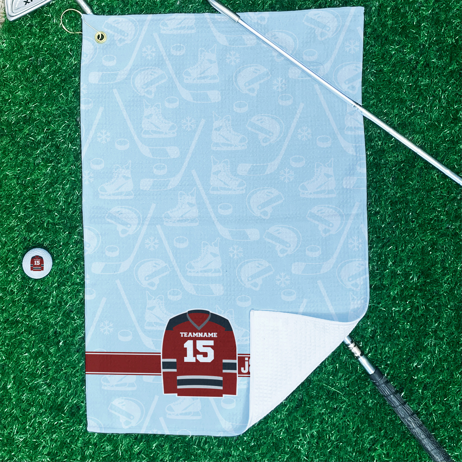 This design features a white background, reminiscent of ice, with hockey pucks repeating on it. The main design has a red hockey jersey in the foreground that can be customized with your favorite team's colors. This design perfect for any die-hard hockey fans!