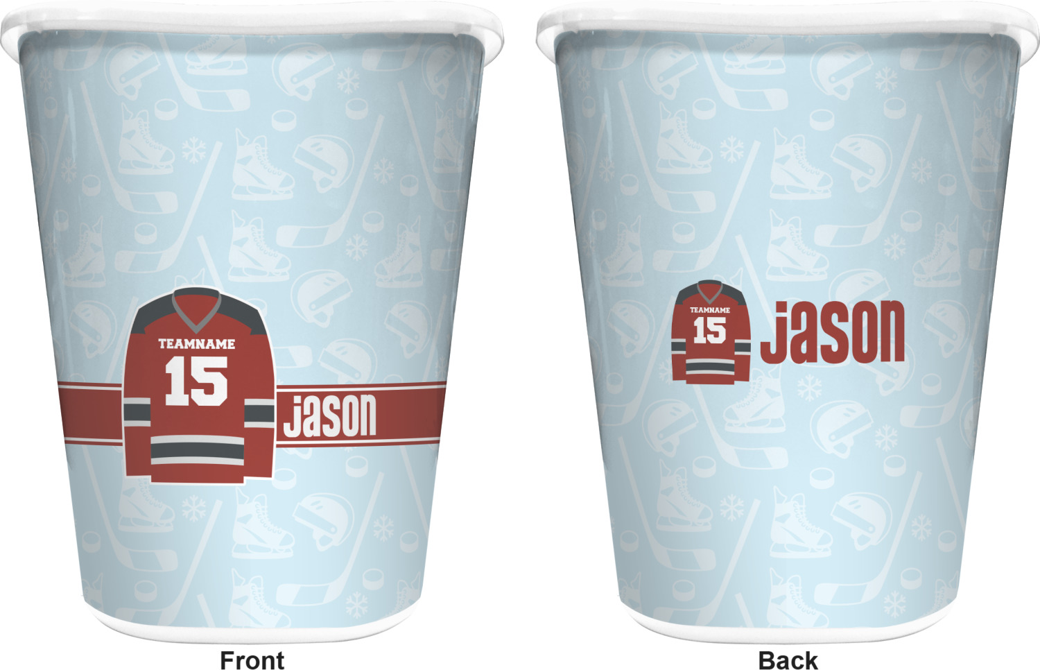 This design features a white background, reminiscent of ice, with hockey pucks repeating on it. The main design has a red hockey jersey in the foreground that can be customized with your favorite team's colors. This design perfect for any die-hard hockey fans!