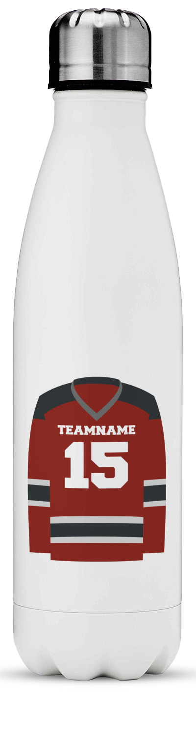 This design features a white background, reminiscent of ice, with hockey pucks repeating on it. The main design has a red hockey jersey in the foreground that can be customized with your favorite team's colors. This design perfect for any die-hard hockey fans!