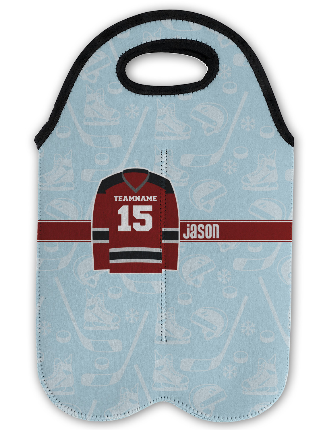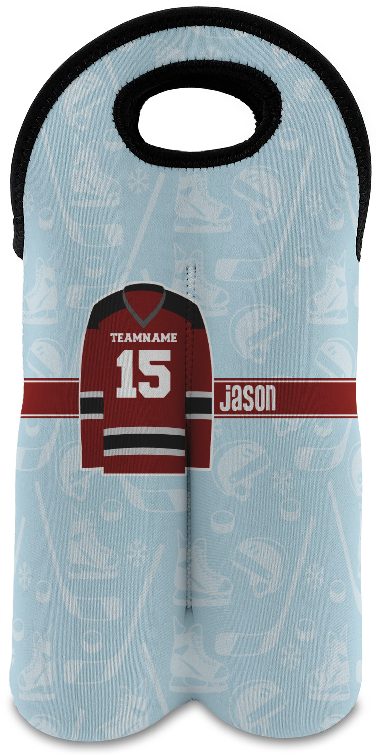 This design features a white background, reminiscent of ice, with hockey pucks repeating on it. The main design has a red hockey jersey in the foreground that can be customized with your favorite team's colors. This design perfect for any die-hard hockey fans!
