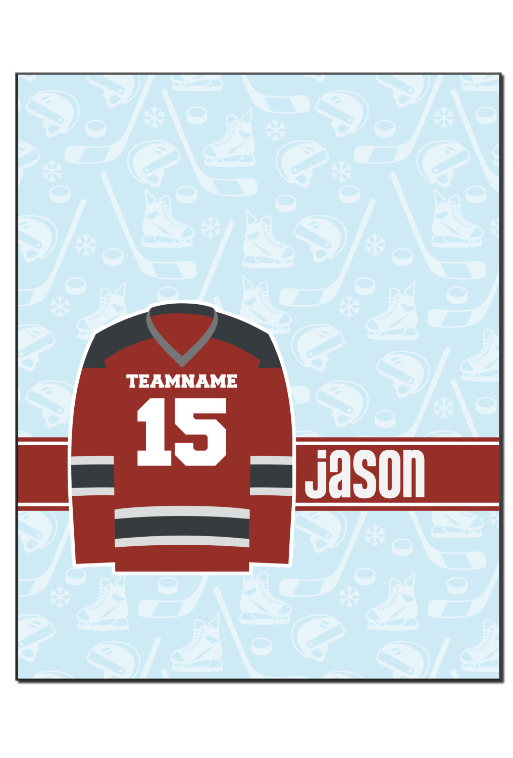 This design features a white background, reminiscent of ice, with hockey pucks repeating on it. The main design has a red hockey jersey in the foreground that can be customized with your favorite team's colors. This design perfect for any die-hard hockey fans!