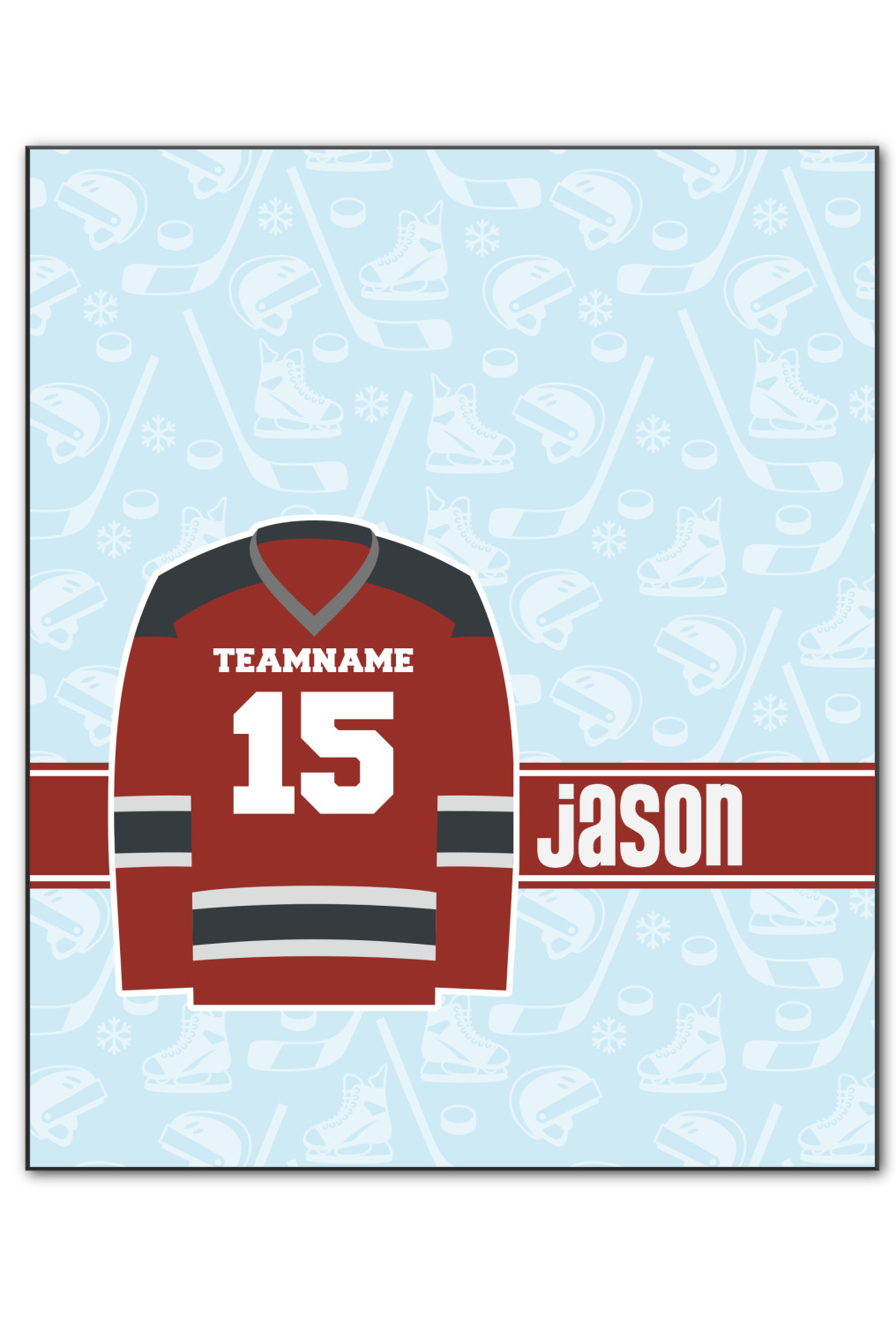 This design features a white background, reminiscent of ice, with hockey pucks repeating on it. The main design has a red hockey jersey in the foreground that can be customized with your favorite team's colors. This design perfect for any die-hard hockey fans!
