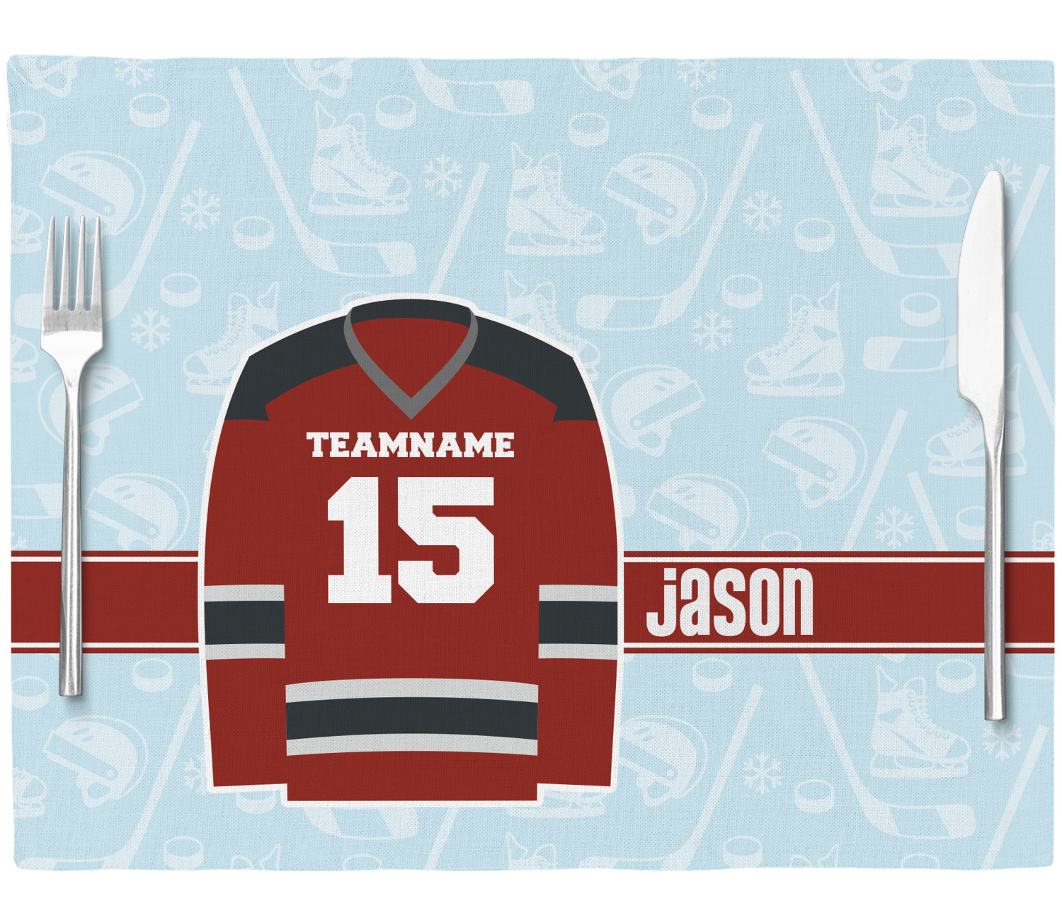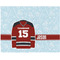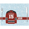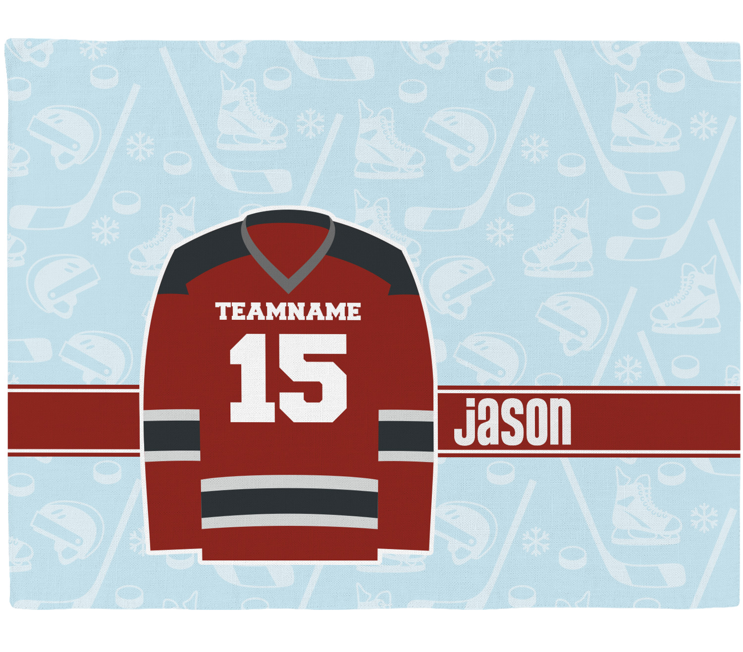This design features a white background, reminiscent of ice, with hockey pucks repeating on it. The main design has a red hockey jersey in the foreground that can be customized with your favorite team's colors. This design perfect for any die-hard hockey fans!