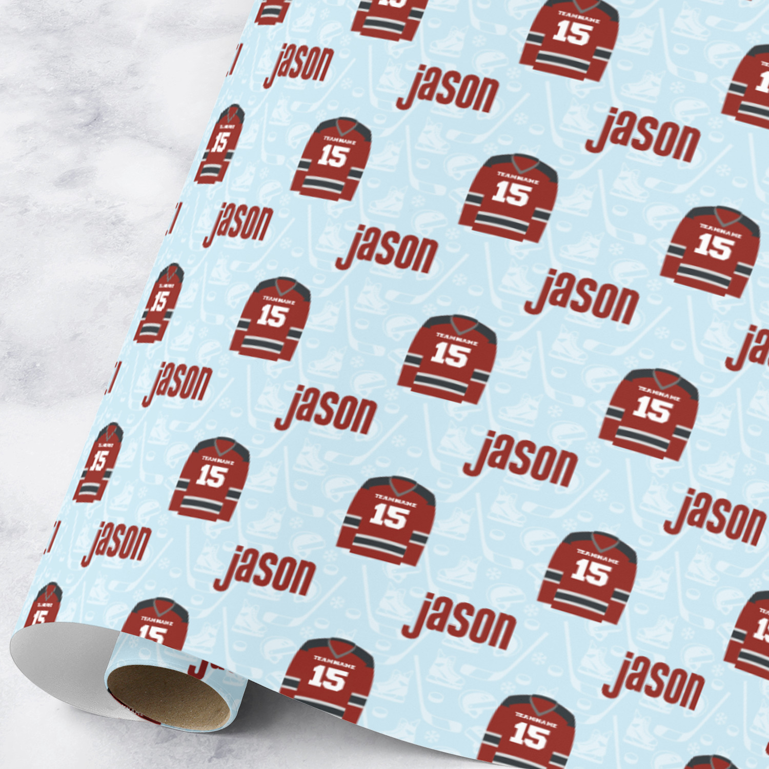 This design features a white background, reminiscent of ice, with hockey pucks repeating on it. The main design has a red hockey jersey in the foreground that can be customized with your favorite team's colors. This design perfect for any die-hard hockey fans!