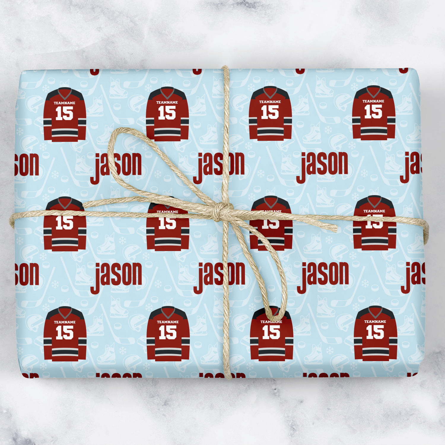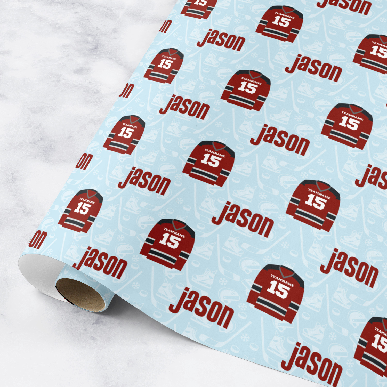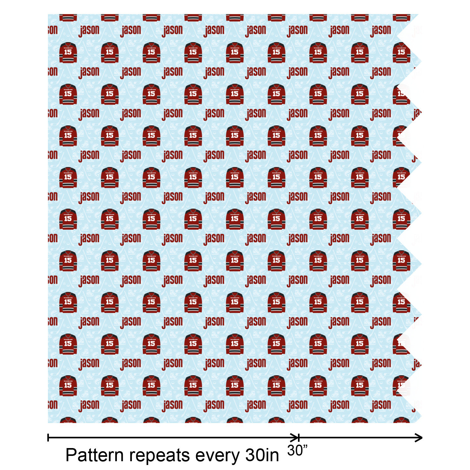 This design features a white background, reminiscent of ice, with hockey pucks repeating on it. The main design has a red hockey jersey in the foreground that can be customized with your favorite team's colors. This design perfect for any die-hard hockey fans!