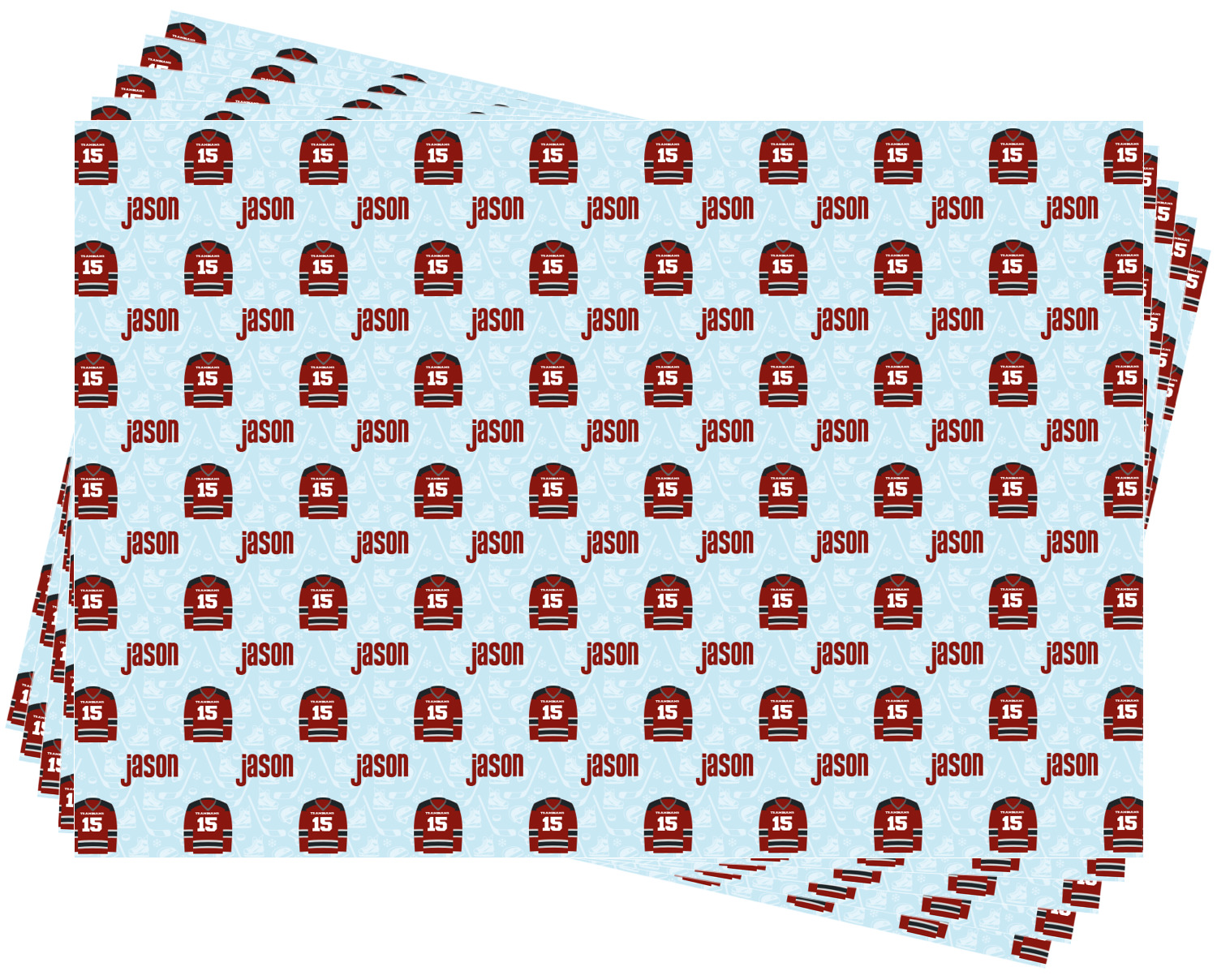 This design features a white background, reminiscent of ice, with hockey pucks repeating on it. The main design has a red hockey jersey in the foreground that can be customized with your favorite team's colors. This design perfect for any die-hard hockey fans!