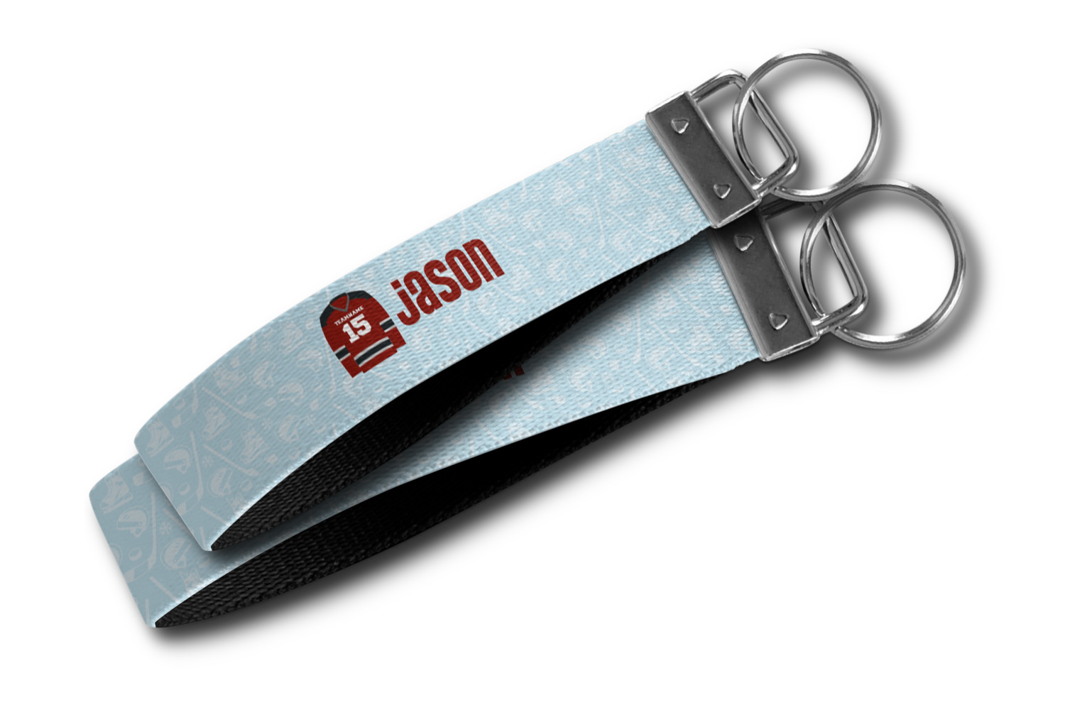 These key fob keychains are made from a polyester weave, right here in the USA. They feature a silver, metal clasp, attached to a round keyring. The piece gives the personalized wristlet a beautiful, finished look. Your customized design is printed on the outside of the keychain strap. We carry these wristlets in two sizes: small, which is 5 inches in width, and large, which is 5.5 inches in width.
