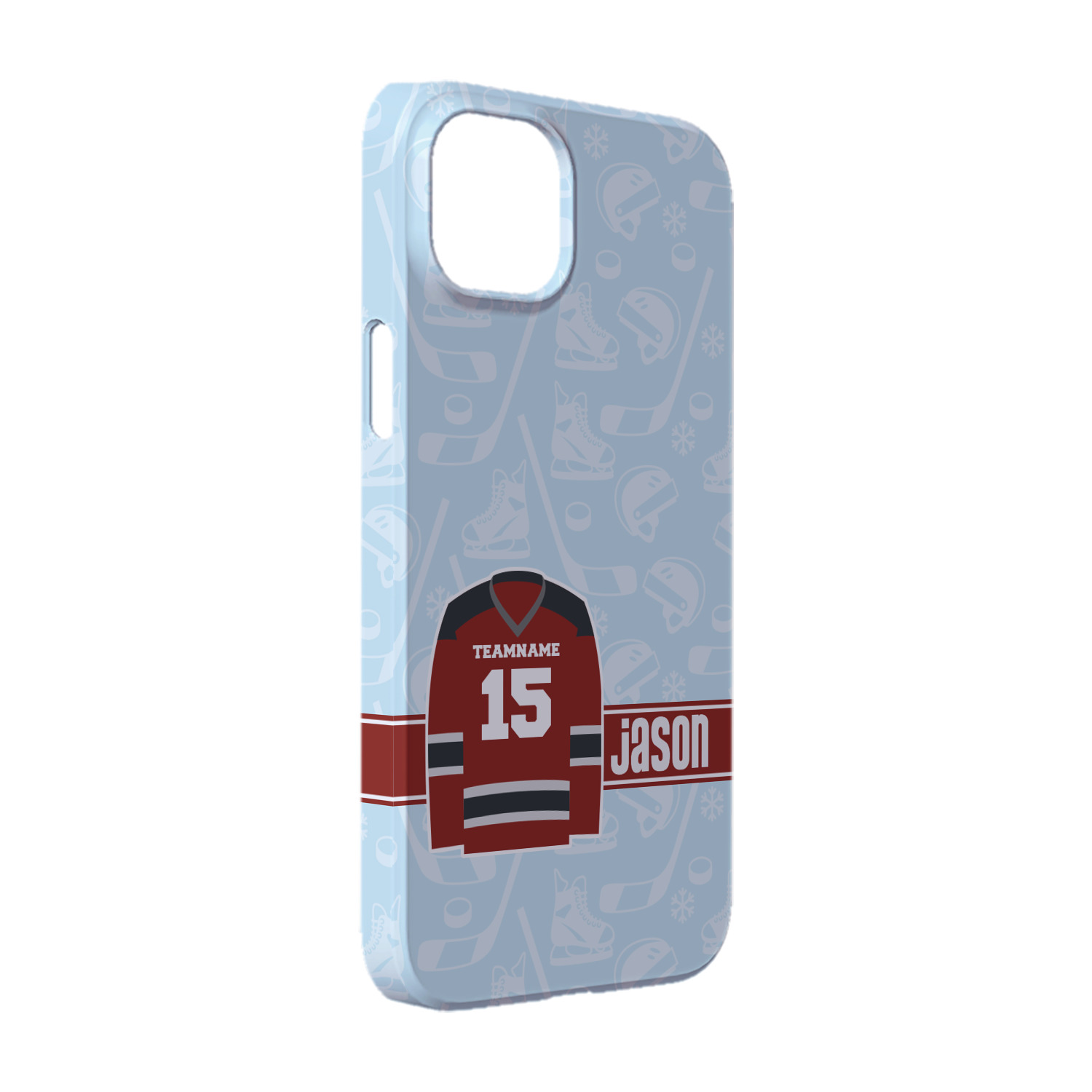 This design features a white background, reminiscent of ice, with hockey pucks repeating on it. The main design has a red hockey jersey in the foreground that can be customized with your favorite team's colors. This design perfect for any die-hard hockey fans!