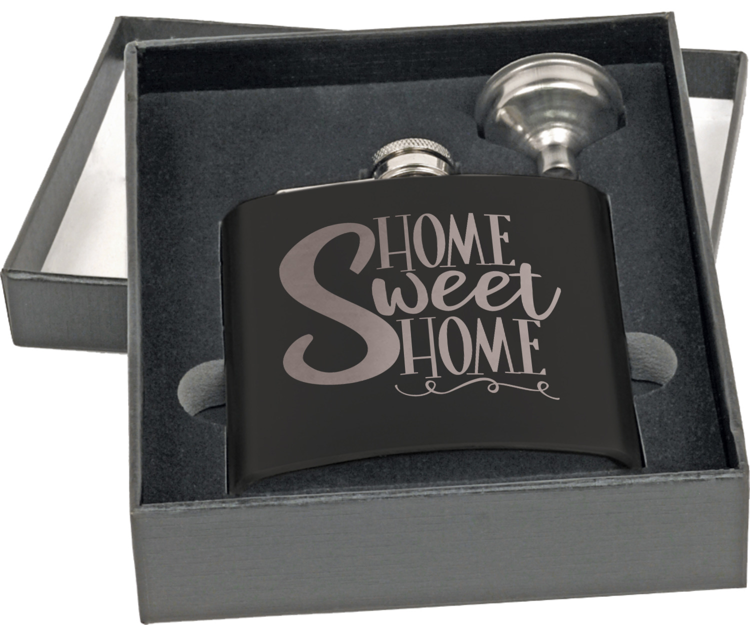 Built from a stainless steel and then covered with a black coating, this hip flask, has a very classy appearance. Similar to the standard flask, this stainless steel flask has the traditional curved shape for a snug fit in your palm. This flask set also includes a traditional screw and flip lid and liquid funnel in a gift box. At 4 by 4.5 inches, this flask can hold up to 6 ounces. Your personalized design is laser-engraved across the front of this flask.