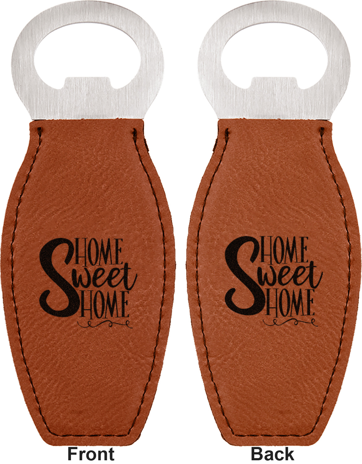 Built from stainless steel, these custom bottle openers are wrapped in a cognac-colored leatherette. Sharp, black stitching lines the edges for extra durability and a finished touch. Your personalization is laser-engraved onto the surface of this leatherette, leaving behind a crisp, black coloration. At 4.6 by 1.8 inches, this beer bottle opener gives you much of leverage when trying to open a stubborn bottle. On the opposite end of the opener, you'll find a magnet that you can use to display your new, unique bottle opener!