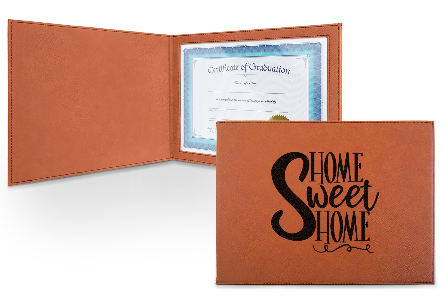 This cognac-colored, leatherette certificate jacket is the ideal way to display or store your hard-earned certificate. When closed, the custom certificate holder measures at 12 by 9 inches. The interior of the certificate cover includes a clear, vinyl window to encase your diploma. The window measures at around 10.5 by 7.5 inches and can accommodate a diploma that measures at up to 8.5 by 11 inches. You can either choose to have your customization laser engraved on the front and interior, or solely the front.