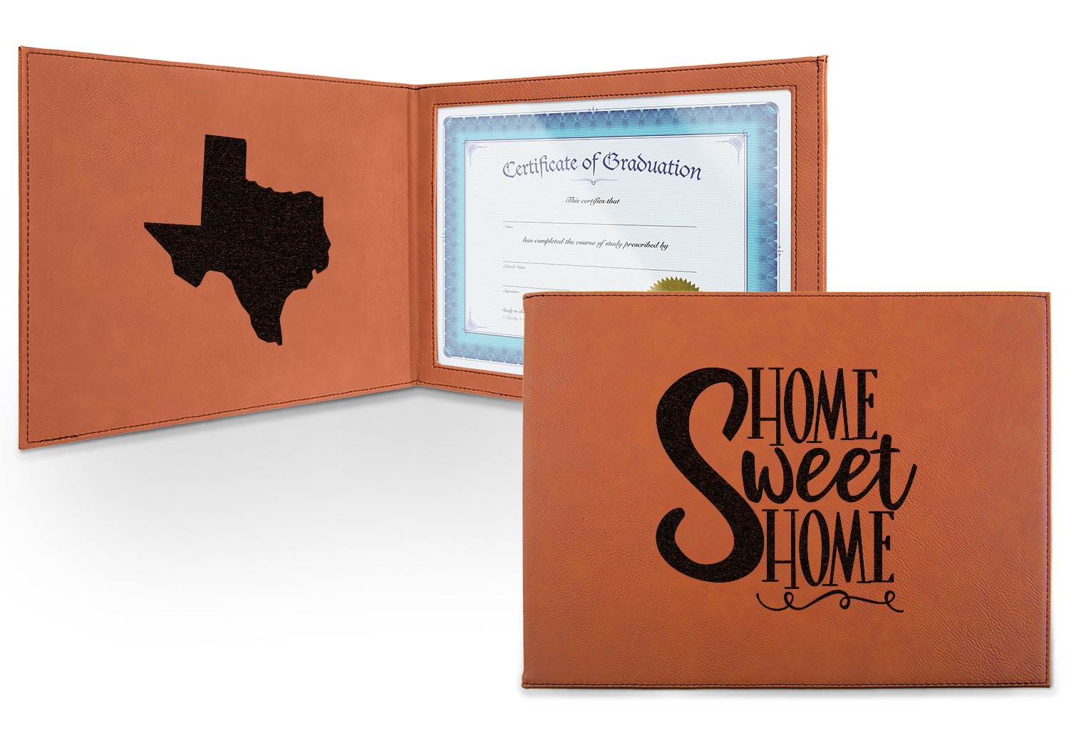 This cognac-colored, leatherette certificate jacket is the ideal way to display or store your hard-earned certificate. When closed, the custom certificate holder measures at 12 by 9 inches. The interior of the certificate cover includes a clear, vinyl window to encase your diploma. The window measures at around 10.5 by 7.5 inches and can accommodate a diploma that measures at up to 8.5 by 11 inches. You can either choose to have your customization laser engraved on the front and interior, or solely the front.