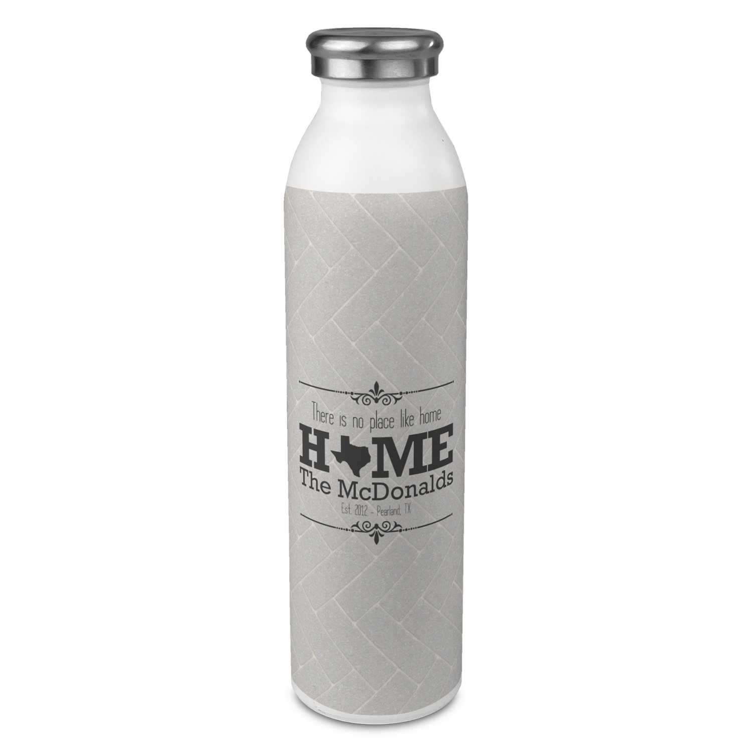 This design features a beatuiful graphic that spells out "Home" with your home state substituted for the "o". You are able to change the state to one of the 50 United States in our system. There is personalizable text above and below this with some ornate brackets on the top and bottom as well. The background is a subtle herringbone brick pattern that gives a nice homey touch. The color scheme is simply light and dark grey. This is the perfect design for home decor or a gift for a friend.
