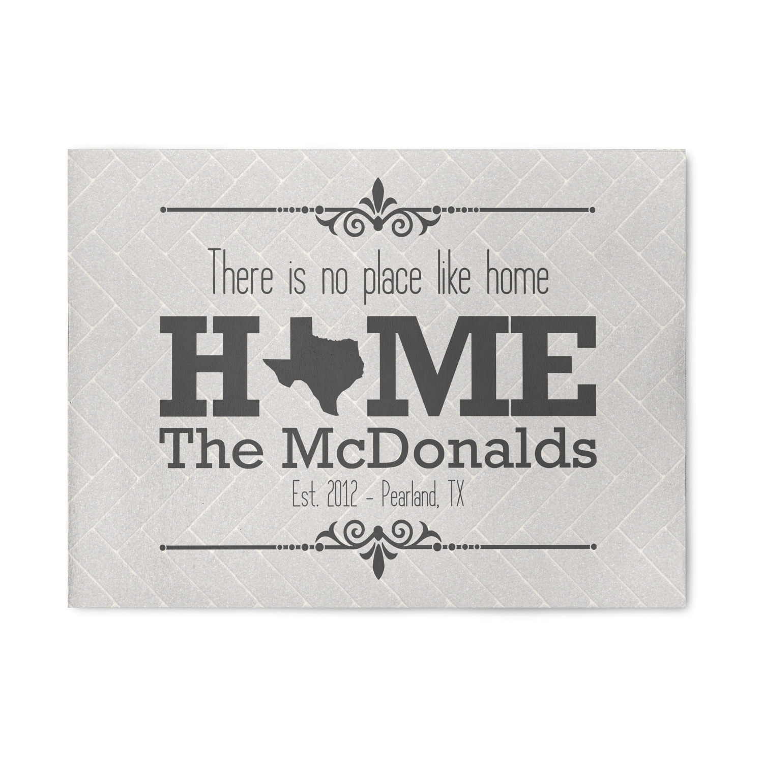 This design features a beatuiful graphic that spells out "Home" with your home state substituted for the "o". You are able to change the state to one of the 50 United States in our system. There is personalizable text above and below this with some ornate brackets on the top and bottom as well. The background is a subtle herringbone brick pattern that gives a nice homey touch. The color scheme is simply light and dark grey. This is the perfect design for home decor or a gift for a friend.