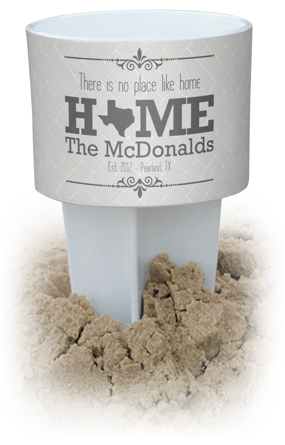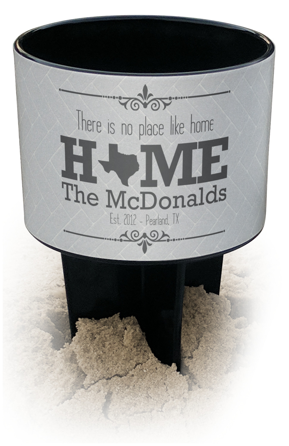 This cup holder has a large stake at its bottom that anchors it to the sand or ground below, while the cup holder rests above the stake. The entire drink holder is made of durable plastic and displays your customization around the cup holder portion. We sell these personalized beach spikers in two different colors: black and white.