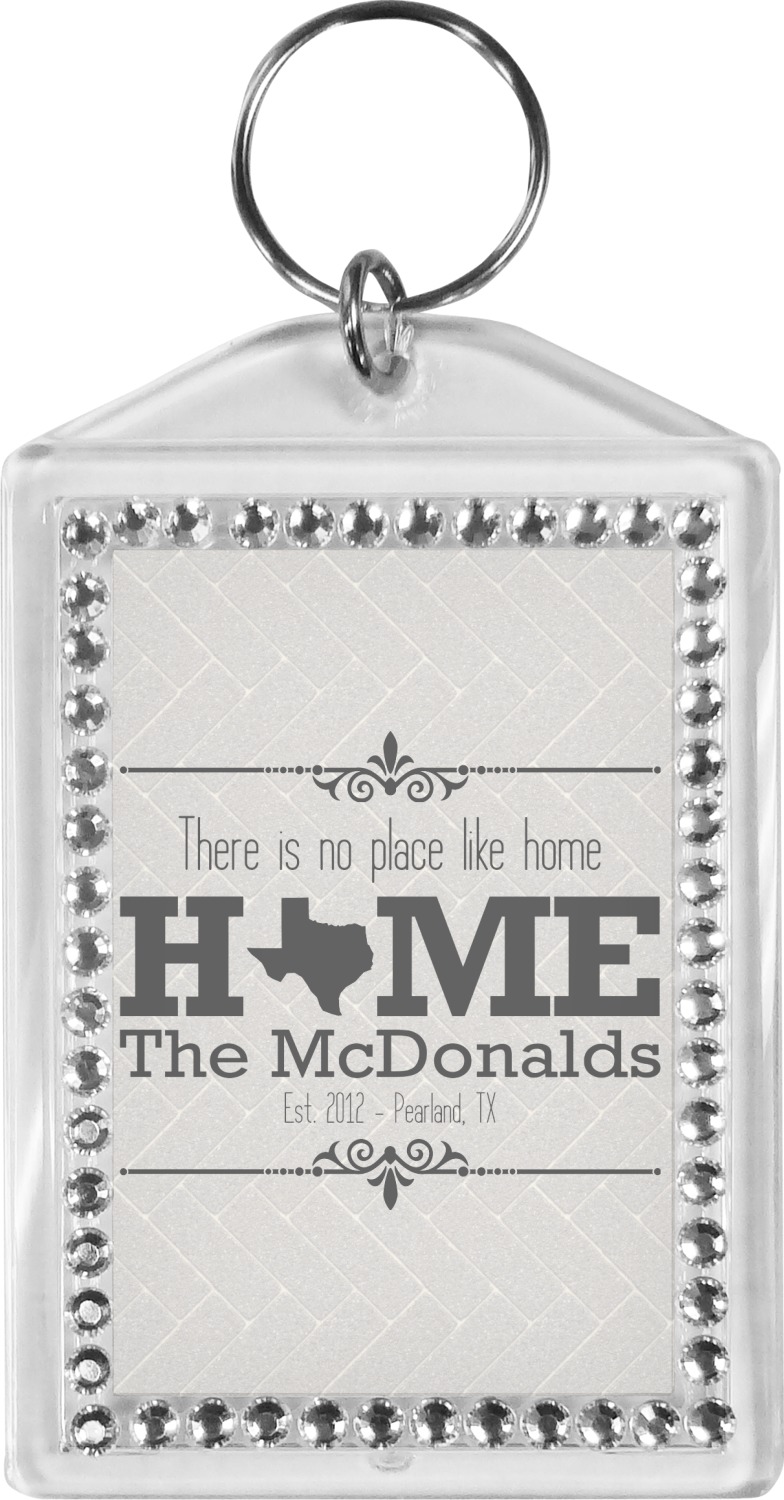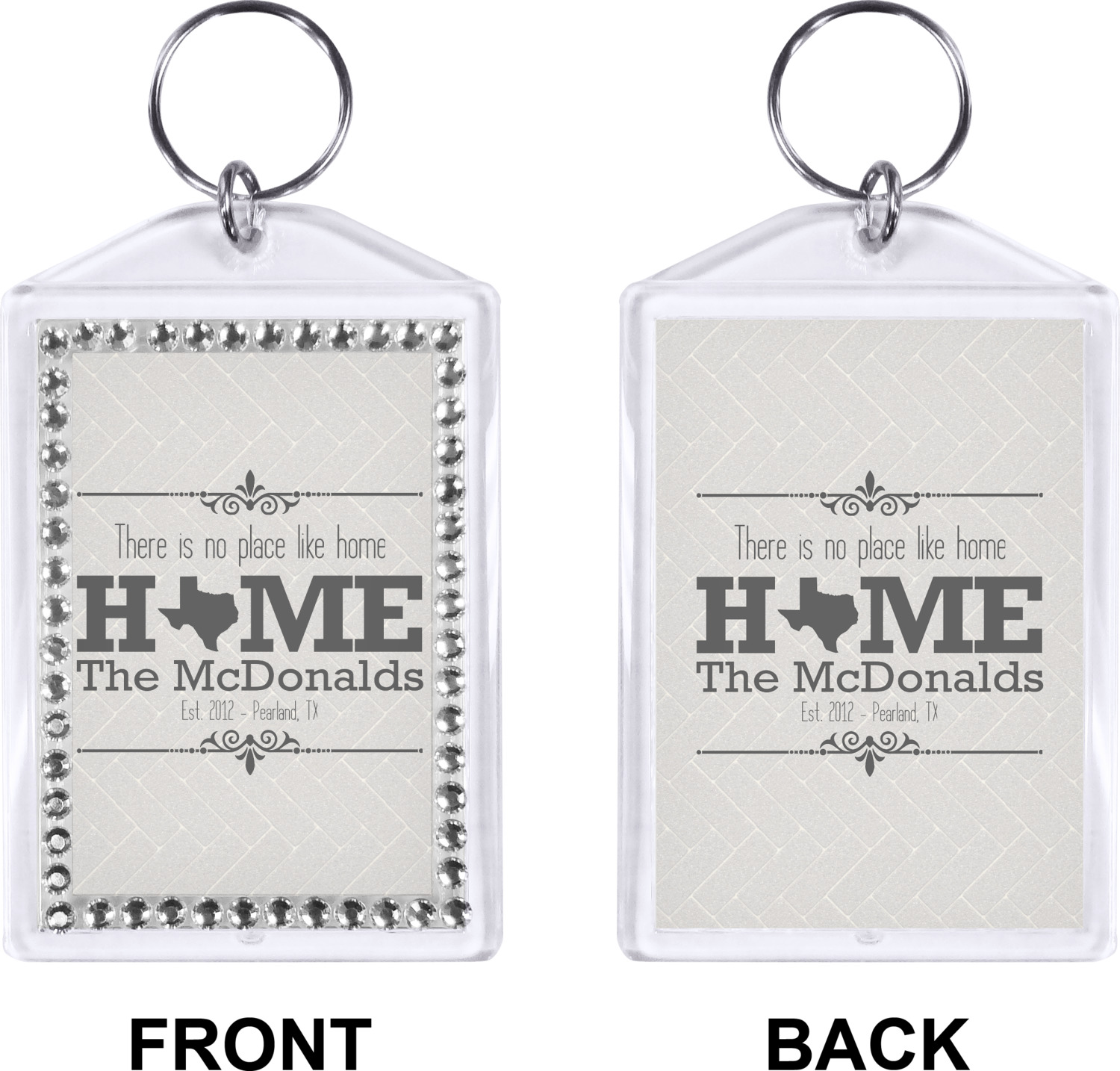 Our personalized keychains have a bold, rectangular shape, outlined by a series of shimmering rhinestones. A metal, split keyring is included with your purchase, and an additional metal hoop allows for attachment of the keychain to the split ring. This unique keychain measures at about 3.75 by 2.5 inches. We print your customized design(s) across both the back and front of this keychain.