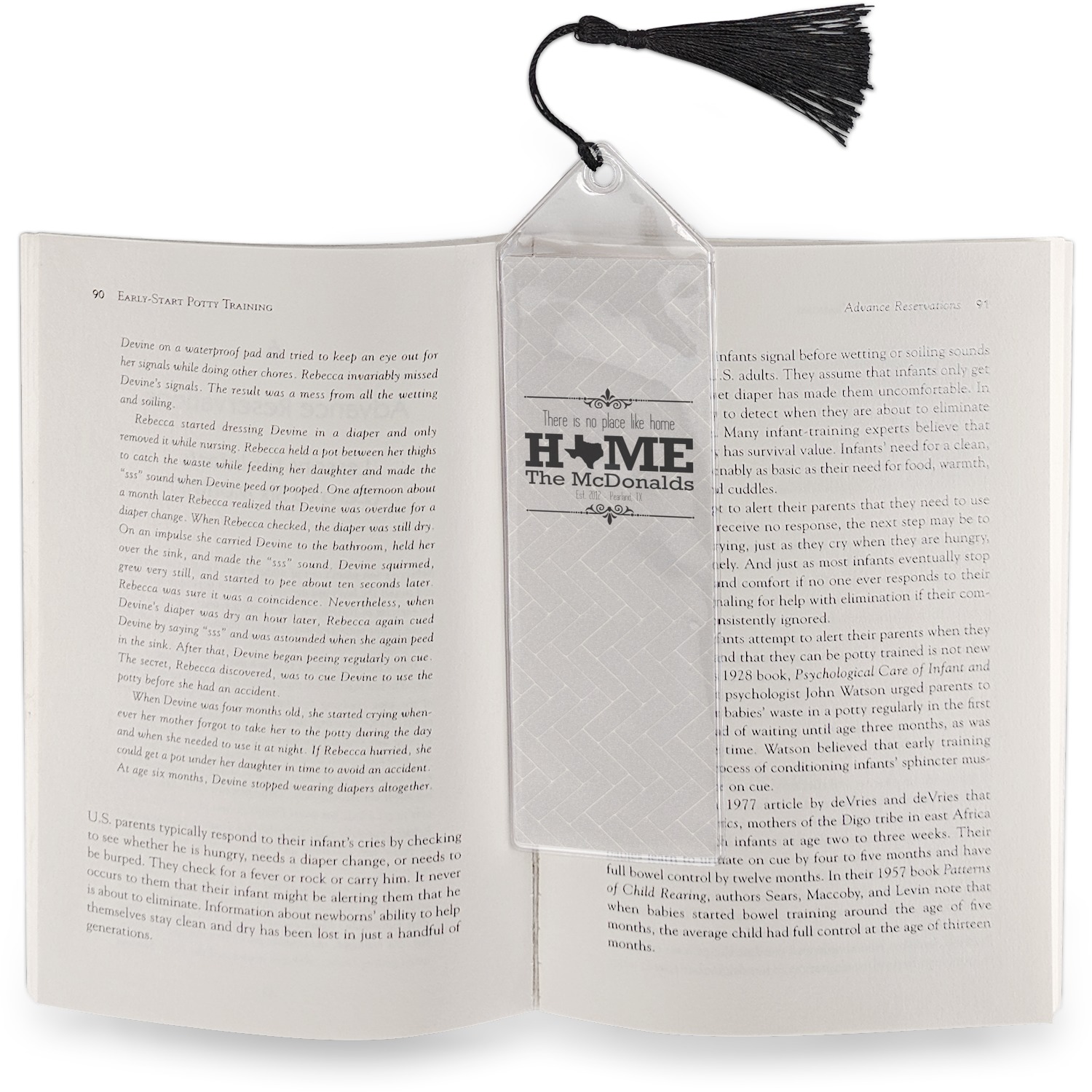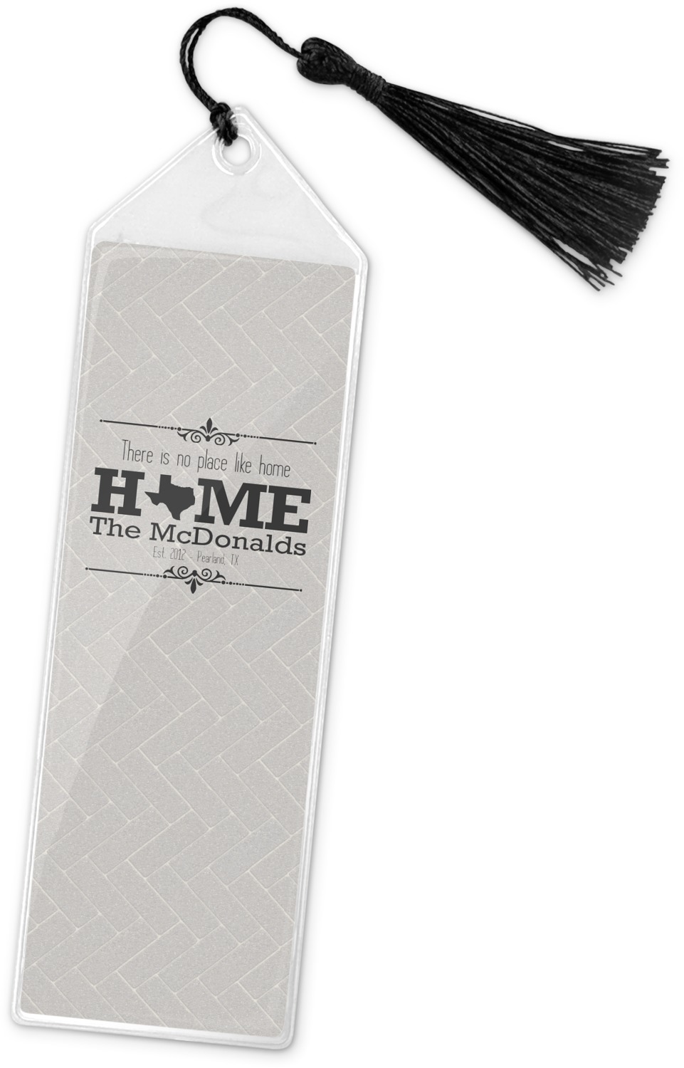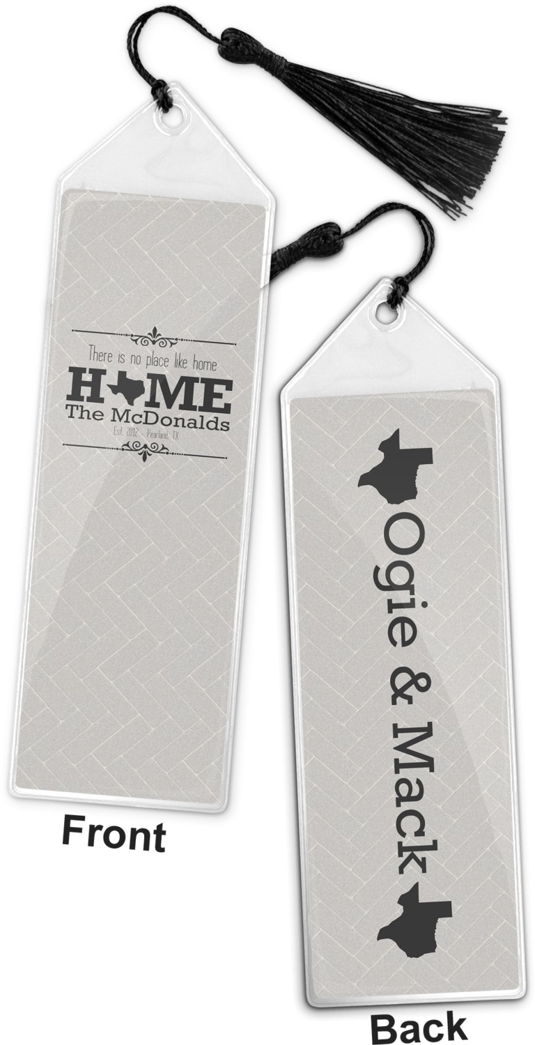 Your personalized bookmark is made of a sturdy, clear vinyl, and is approximately 7.5" x 2.25". We display your personalization on vinyl inserts that are placed on both sides. Accompanying each book marker is a black, fringe tassel that attaches to the reinforced, triangular header.