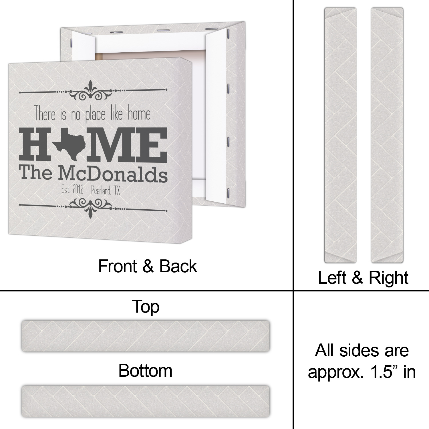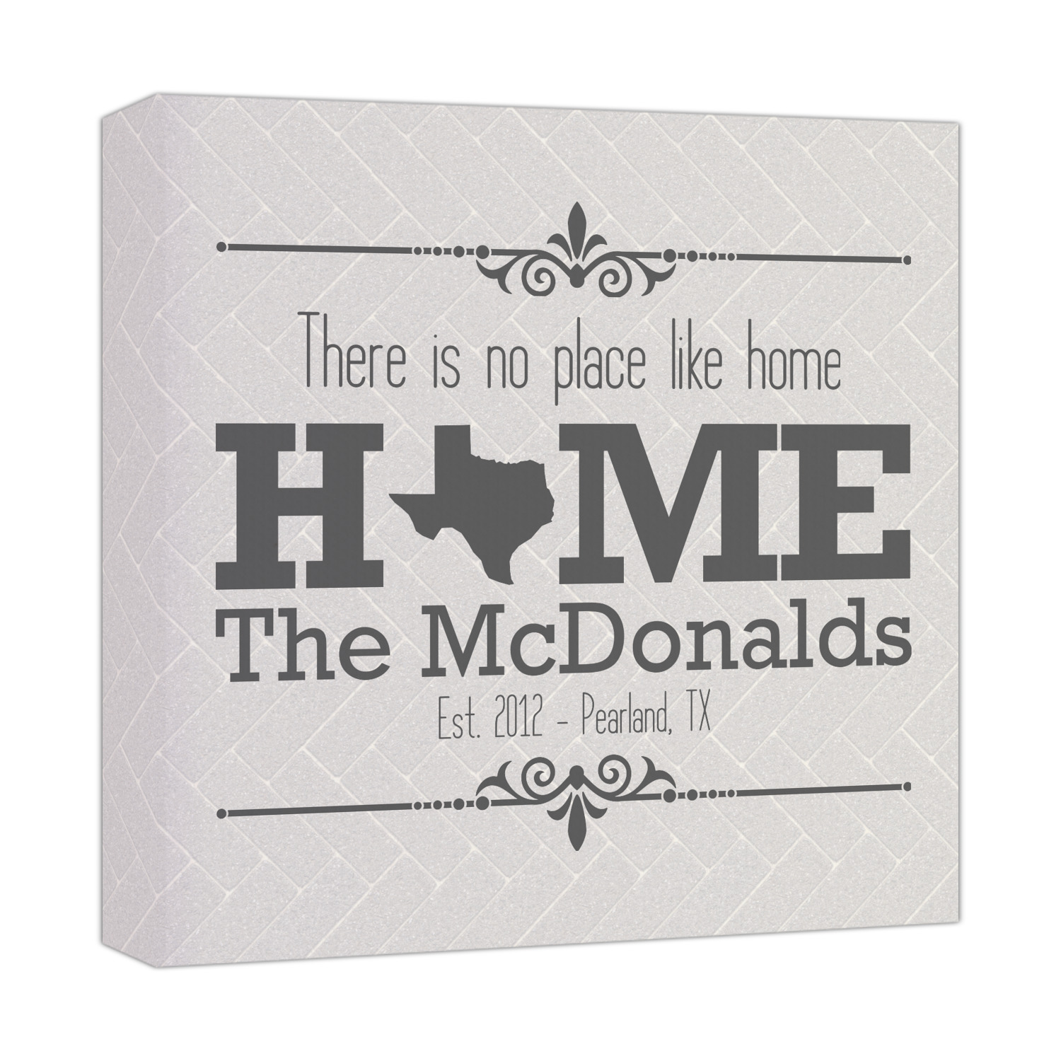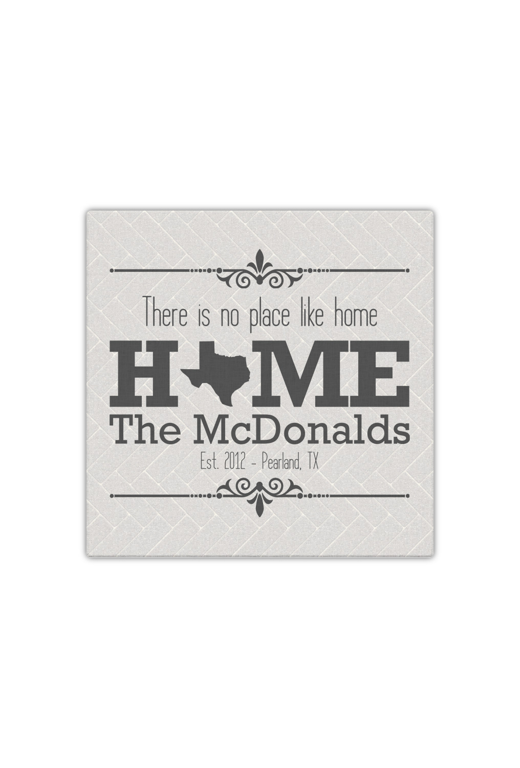 This design features a beatuiful graphic that spells out "Home" with your home state substituted for the "o". You are able to change the state to one of the 50 United States in our system. There is personalizable text above and below this with some ornate brackets on the top and bottom as well. The background is a subtle herringbone brick pattern that gives a nice homey touch. The color scheme is simply light and dark grey. This is the perfect design for home decor or a gift for a friend.